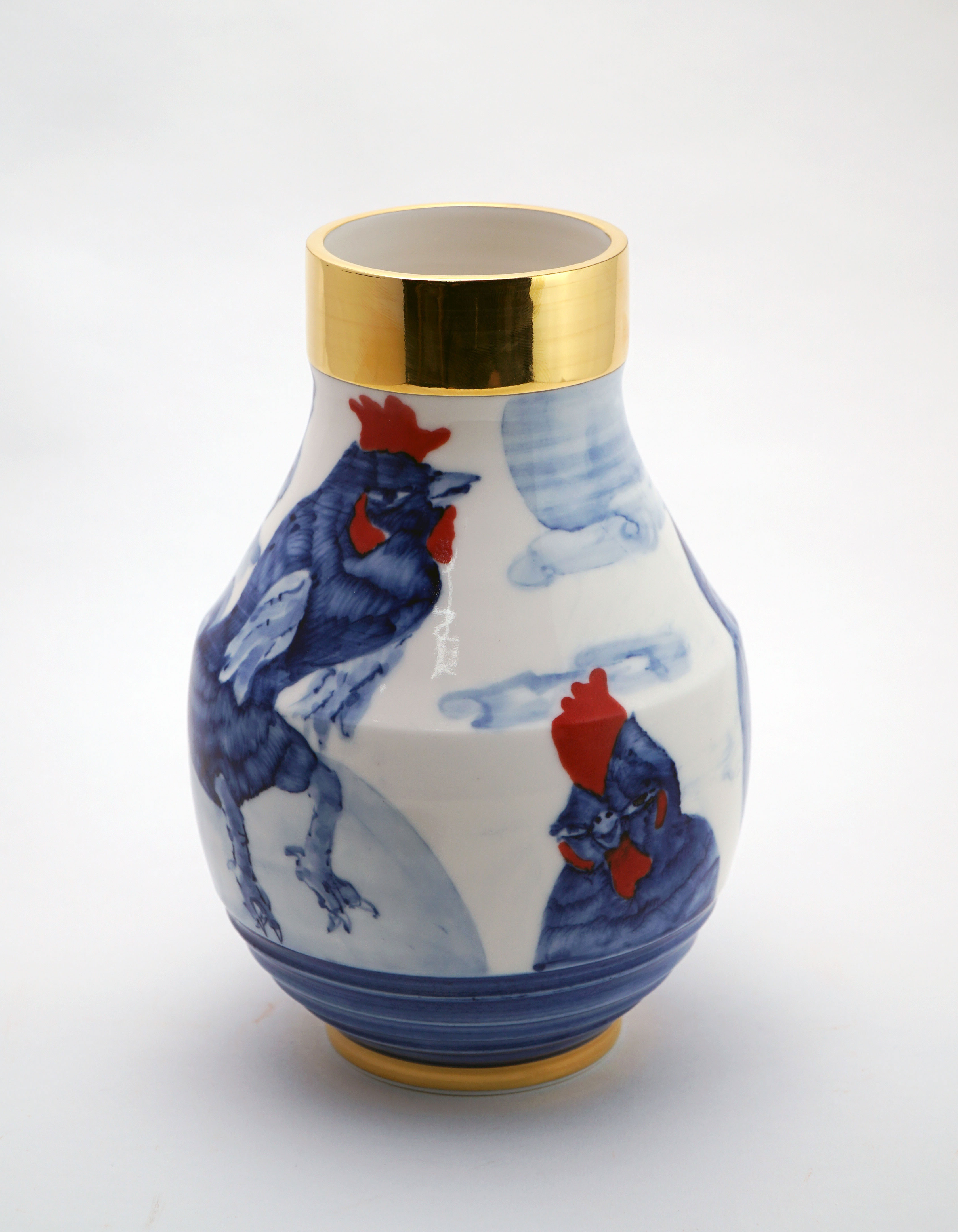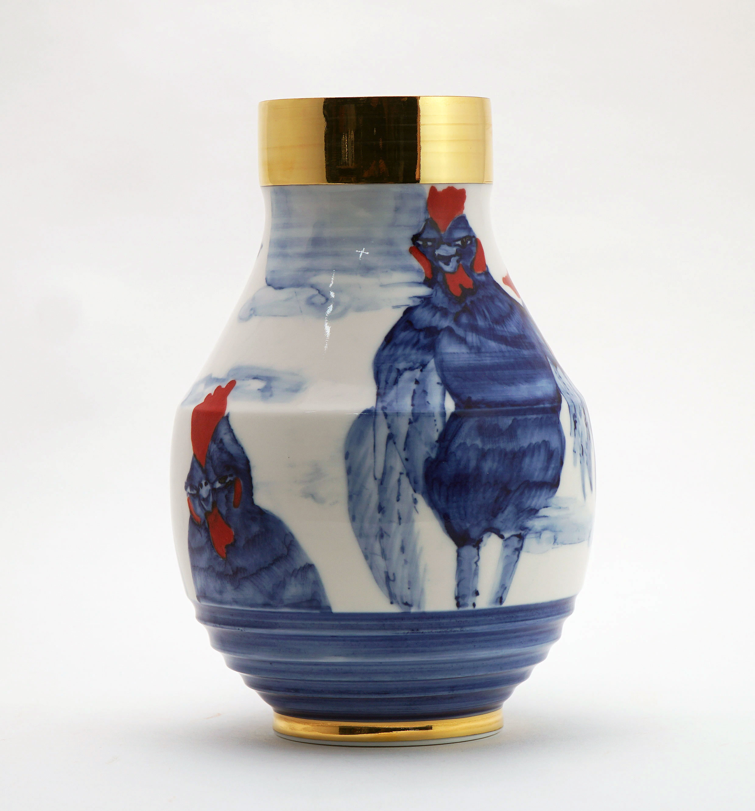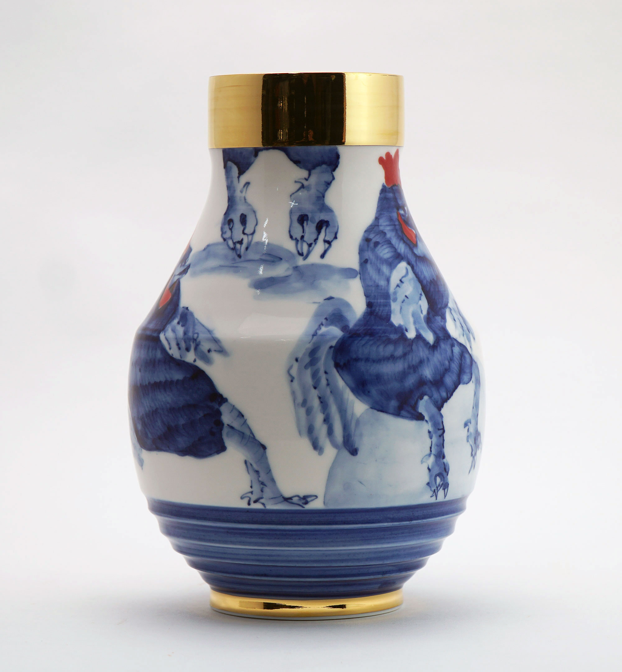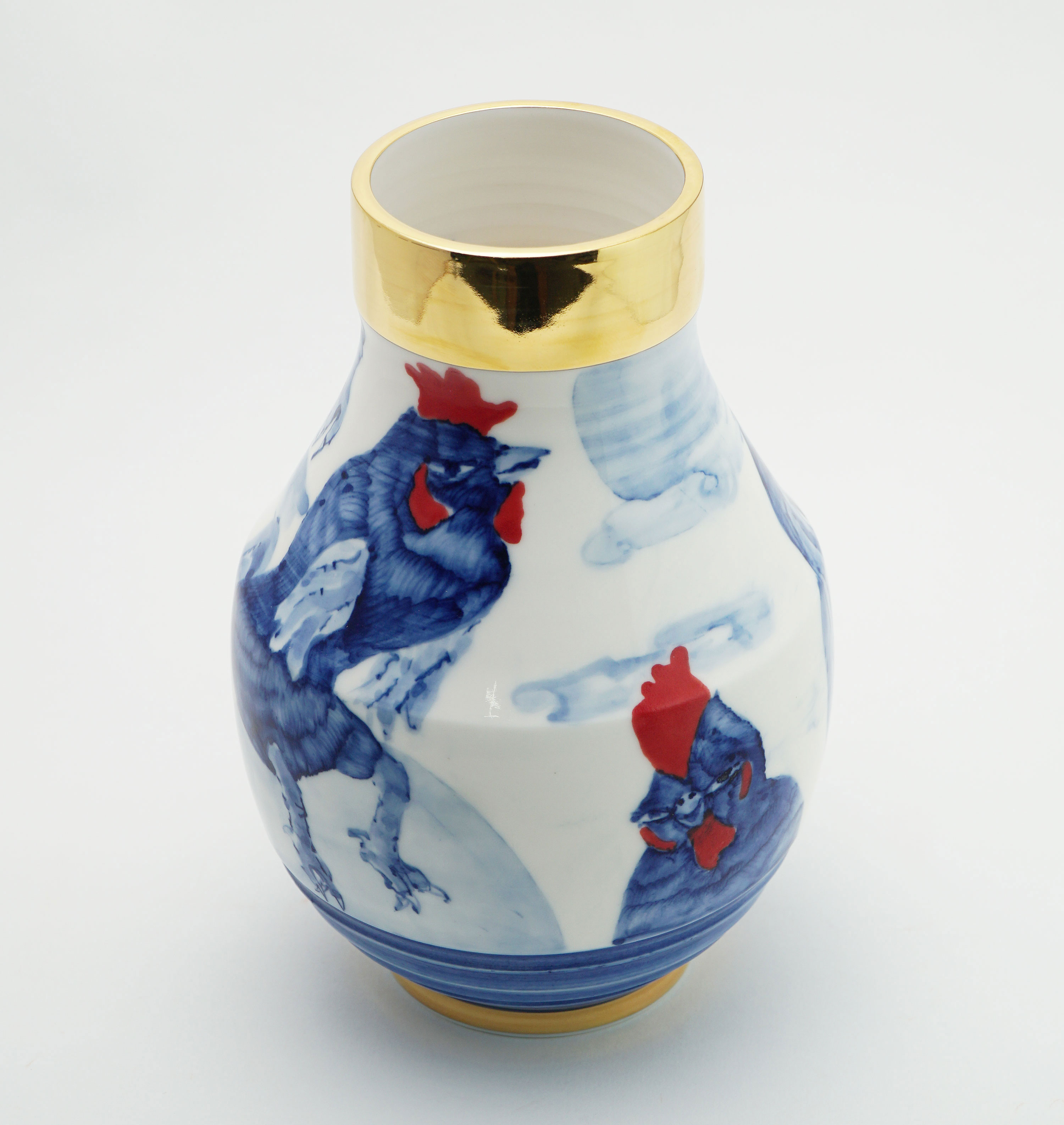 The Moon and Chickens vases are living objects where you can enjoy humorous expressions and playful movements of the chickens. The vases are hand painted and come in a variety of sizes and forms, allowing you to place one or more of them together to make your space even more unique.