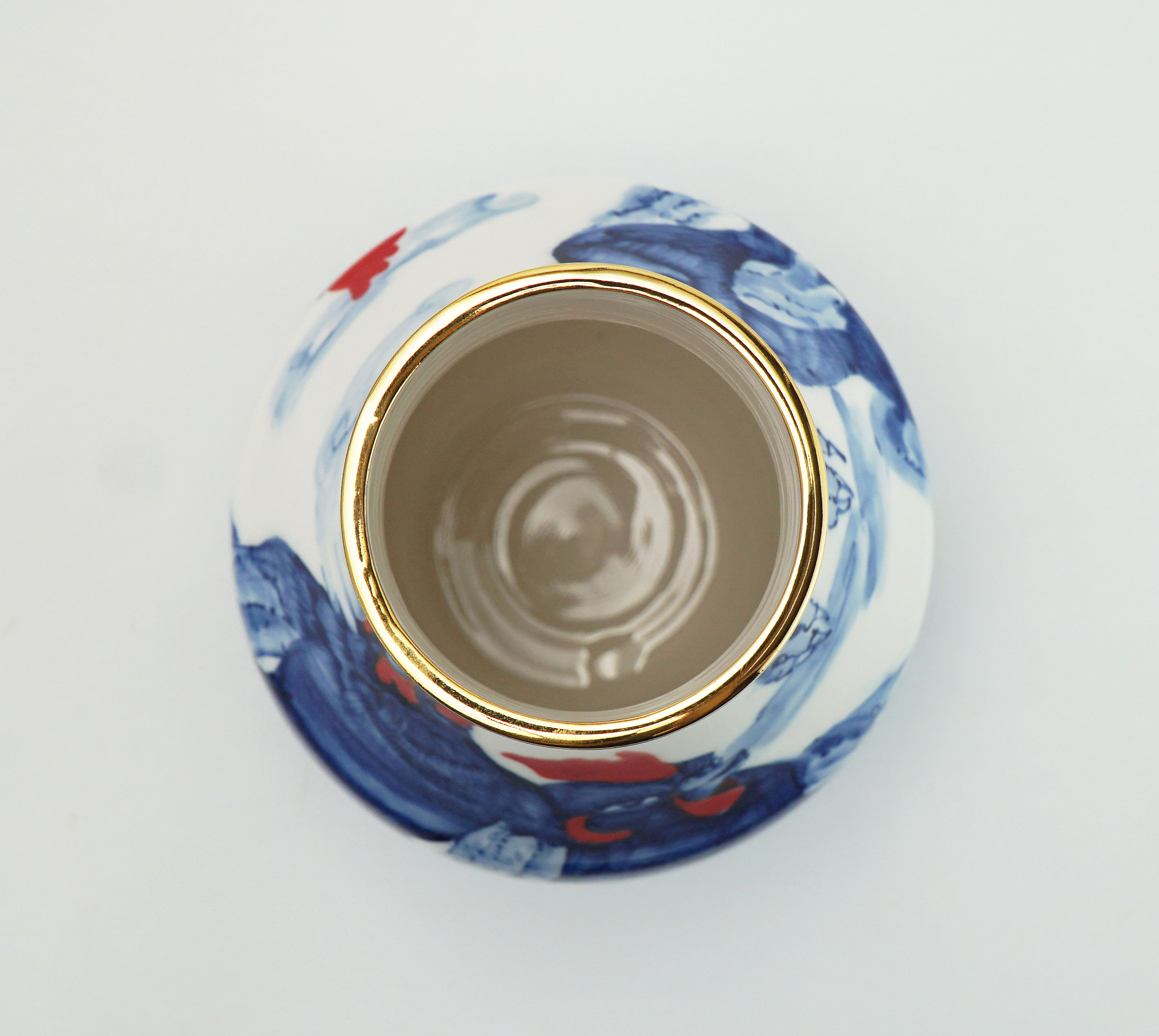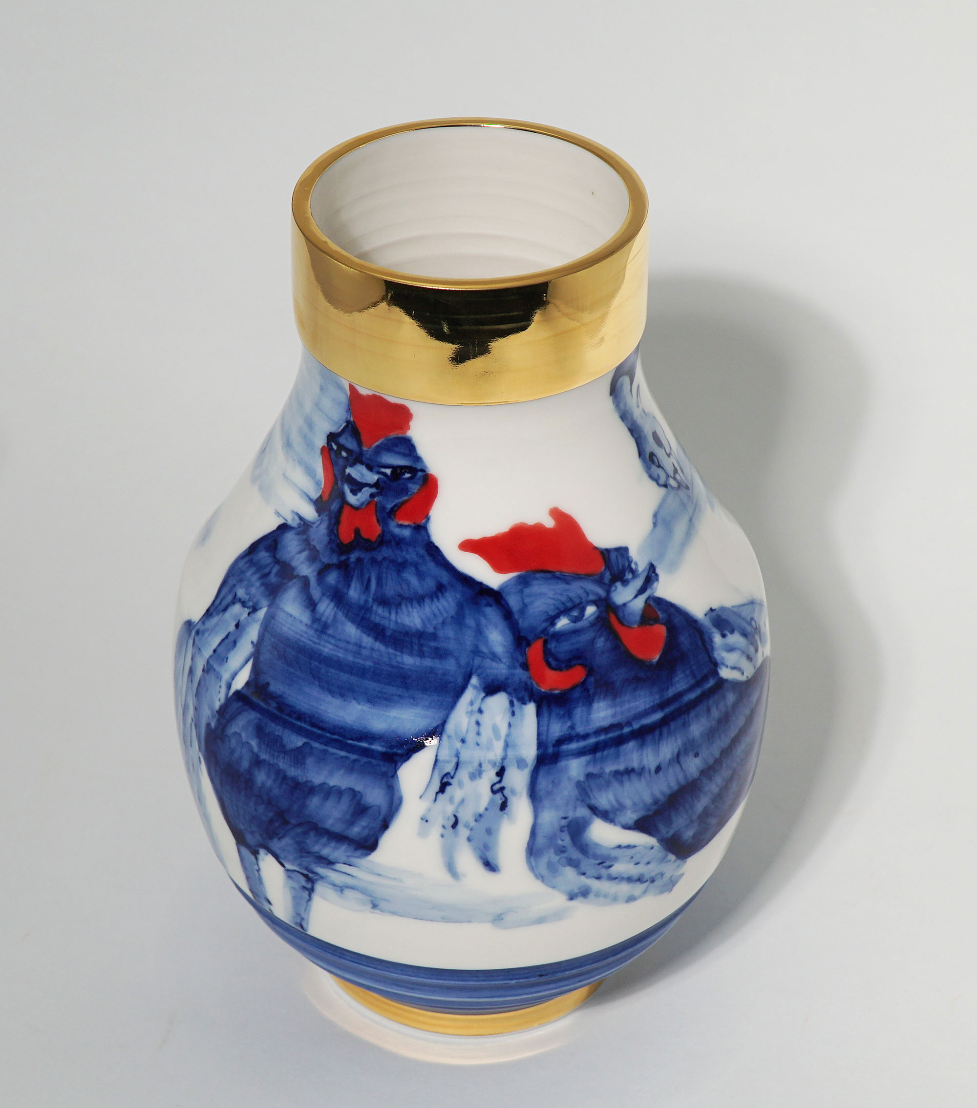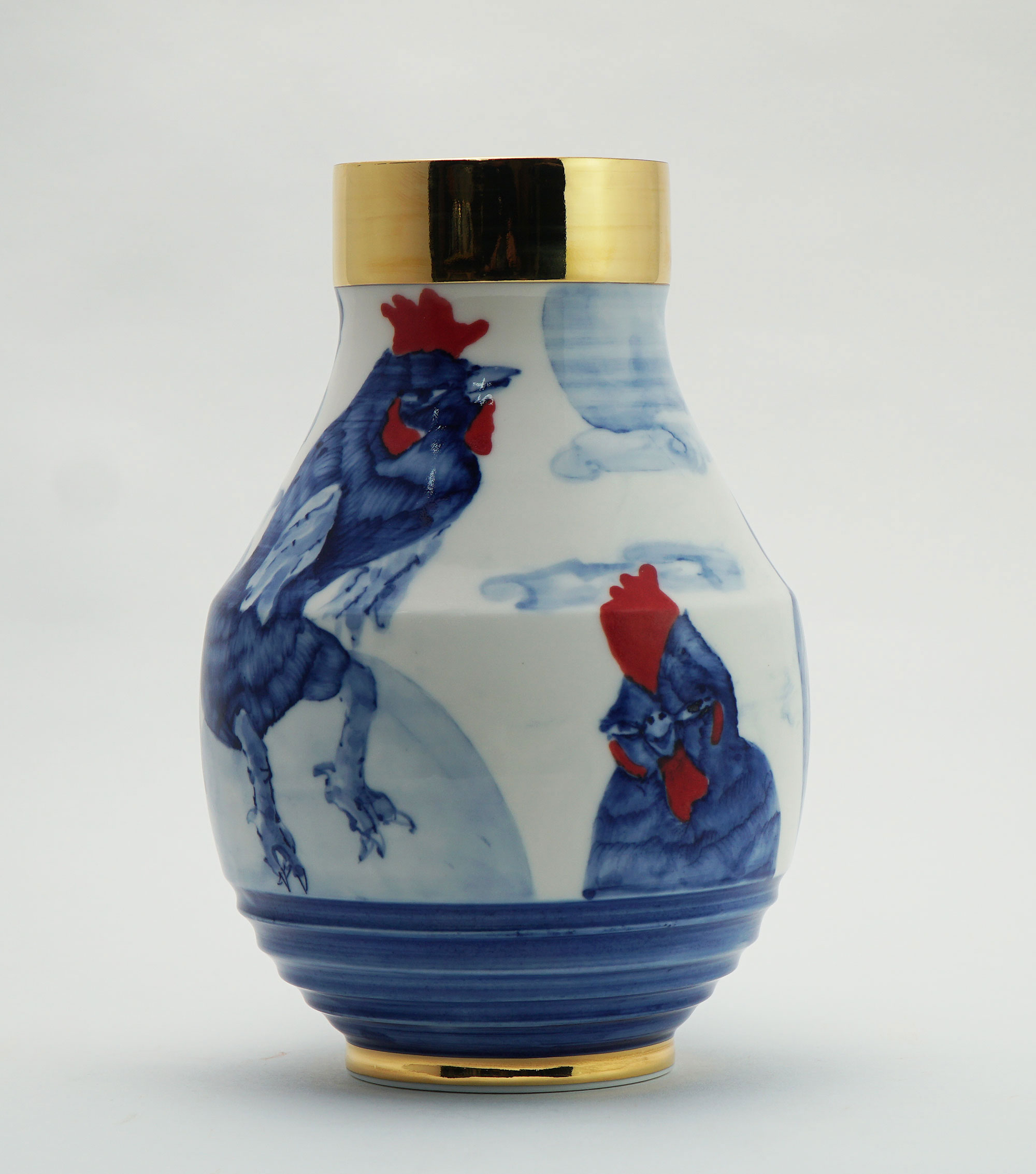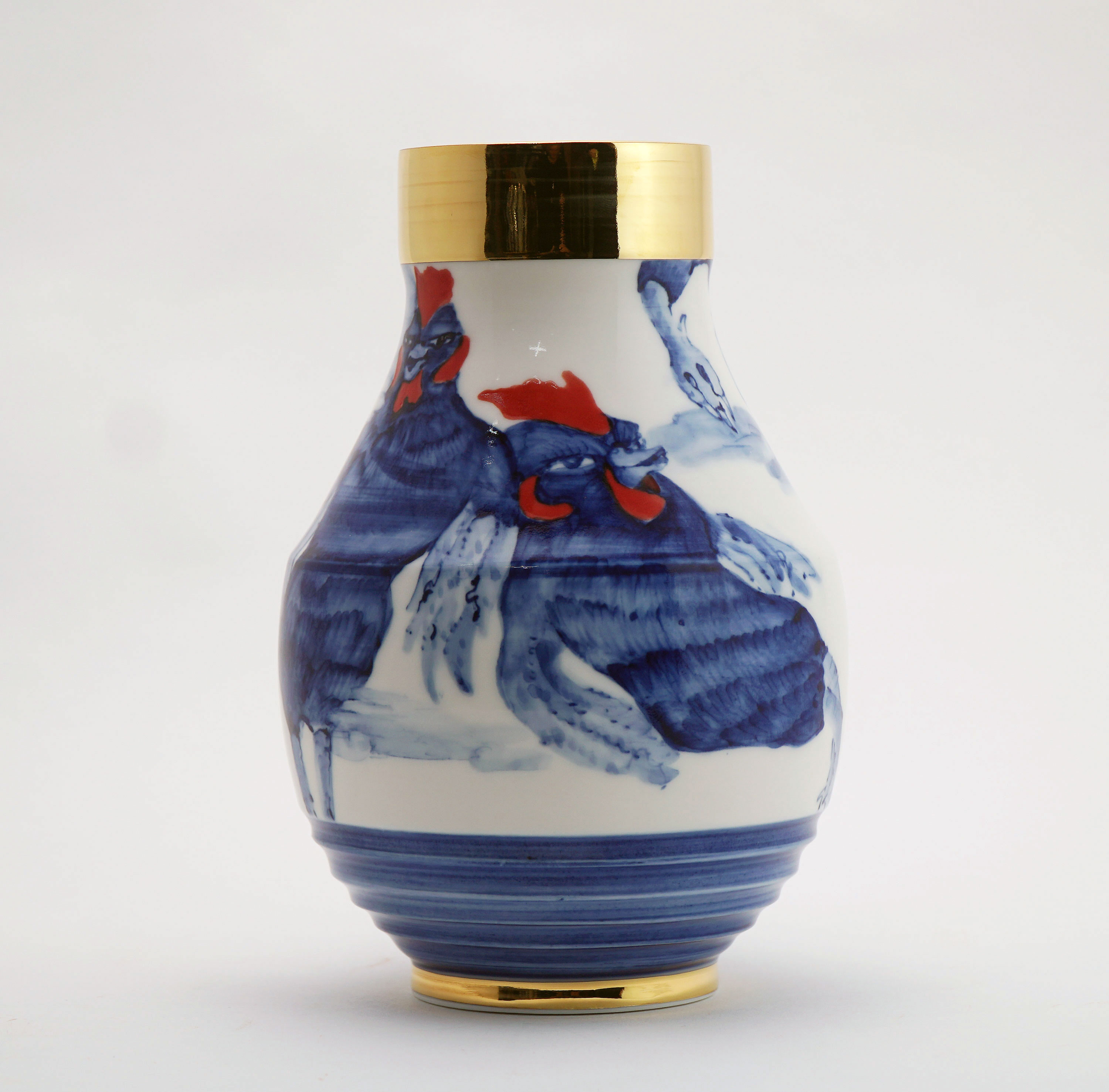 The Moon and Chickens vases are living objects where you can enjoy humorous expressions and playful movements of the chickens. The vases are hand painted and come in a variety of sizes and forms, allowing you to place one or more of them together to make your space even more unique.