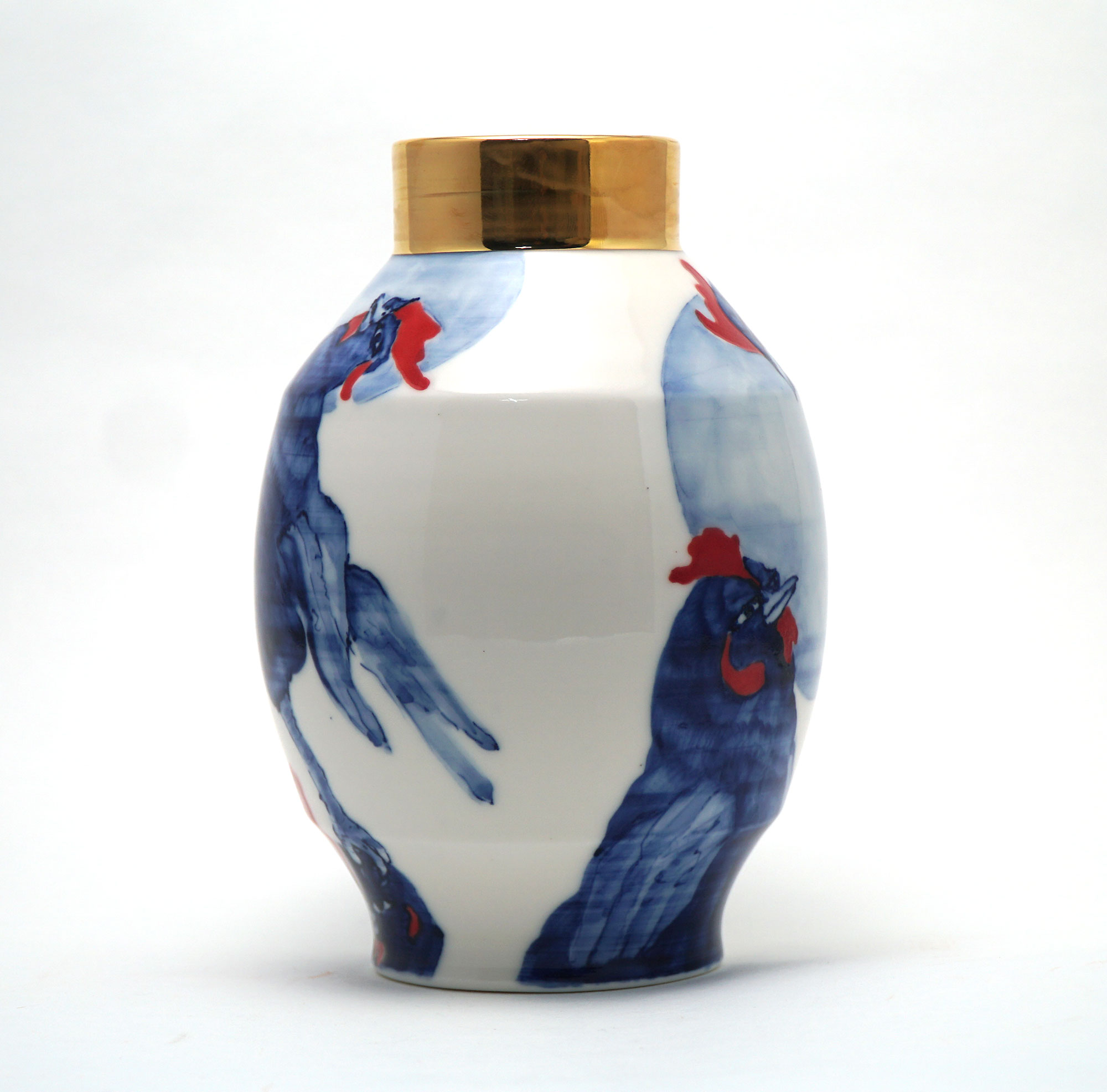 The Moon and Chickens vases are living objects where you can enjoy humorous expressions and playful movements of the chickens. The vases are hand painted and come in a variety of sizes and forms, allowing you to place one or more of them together to make your space even more unique.