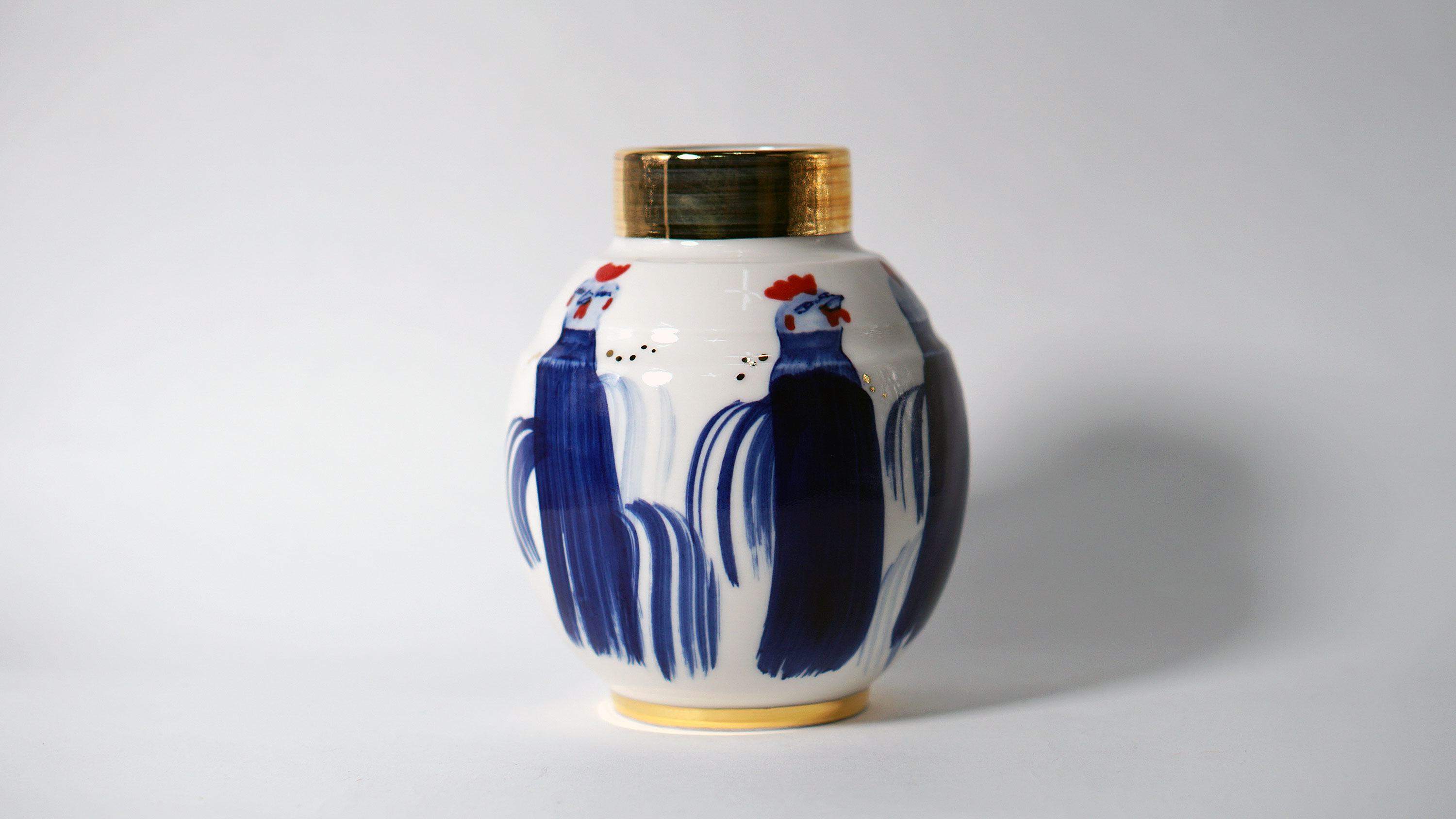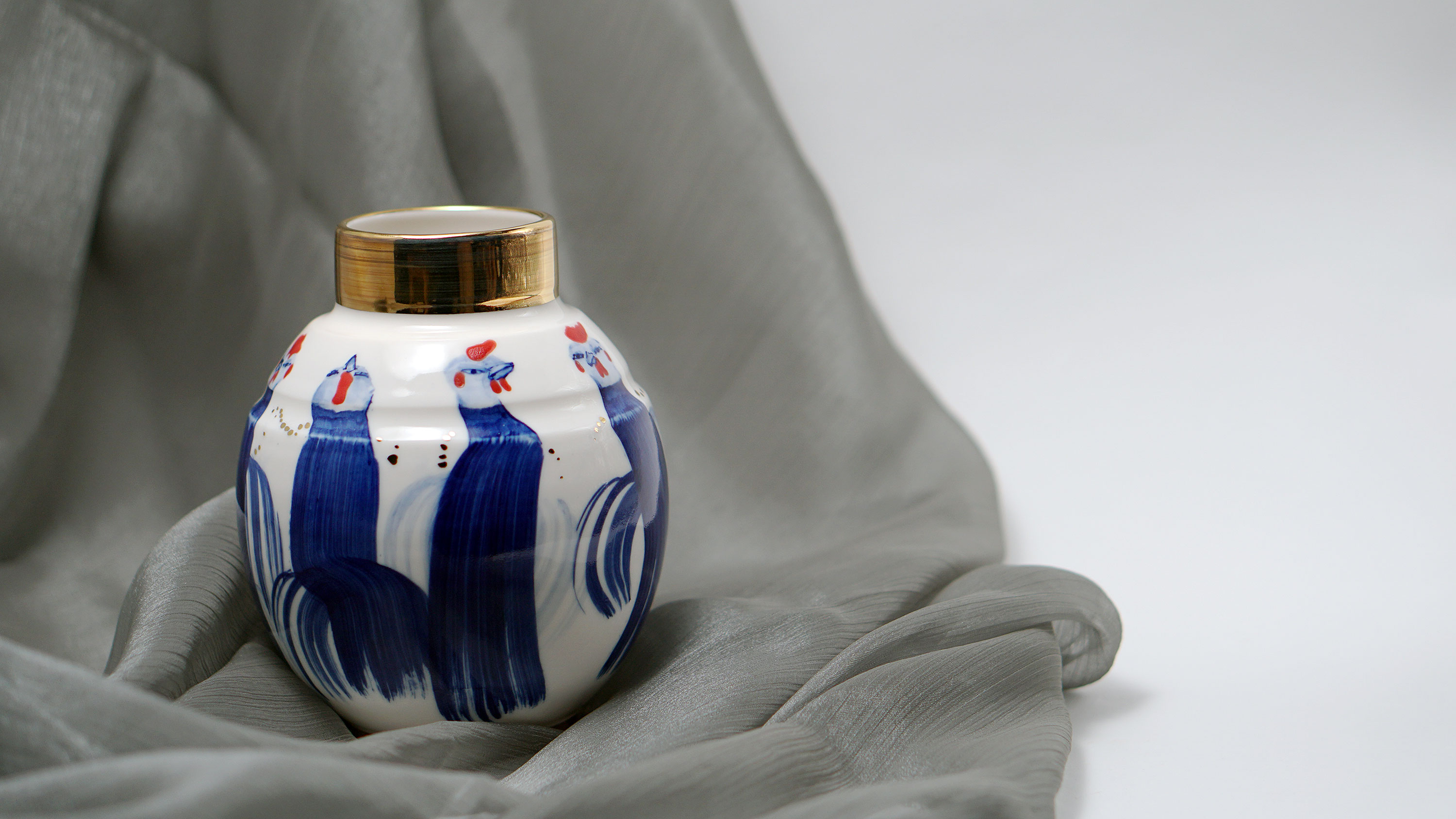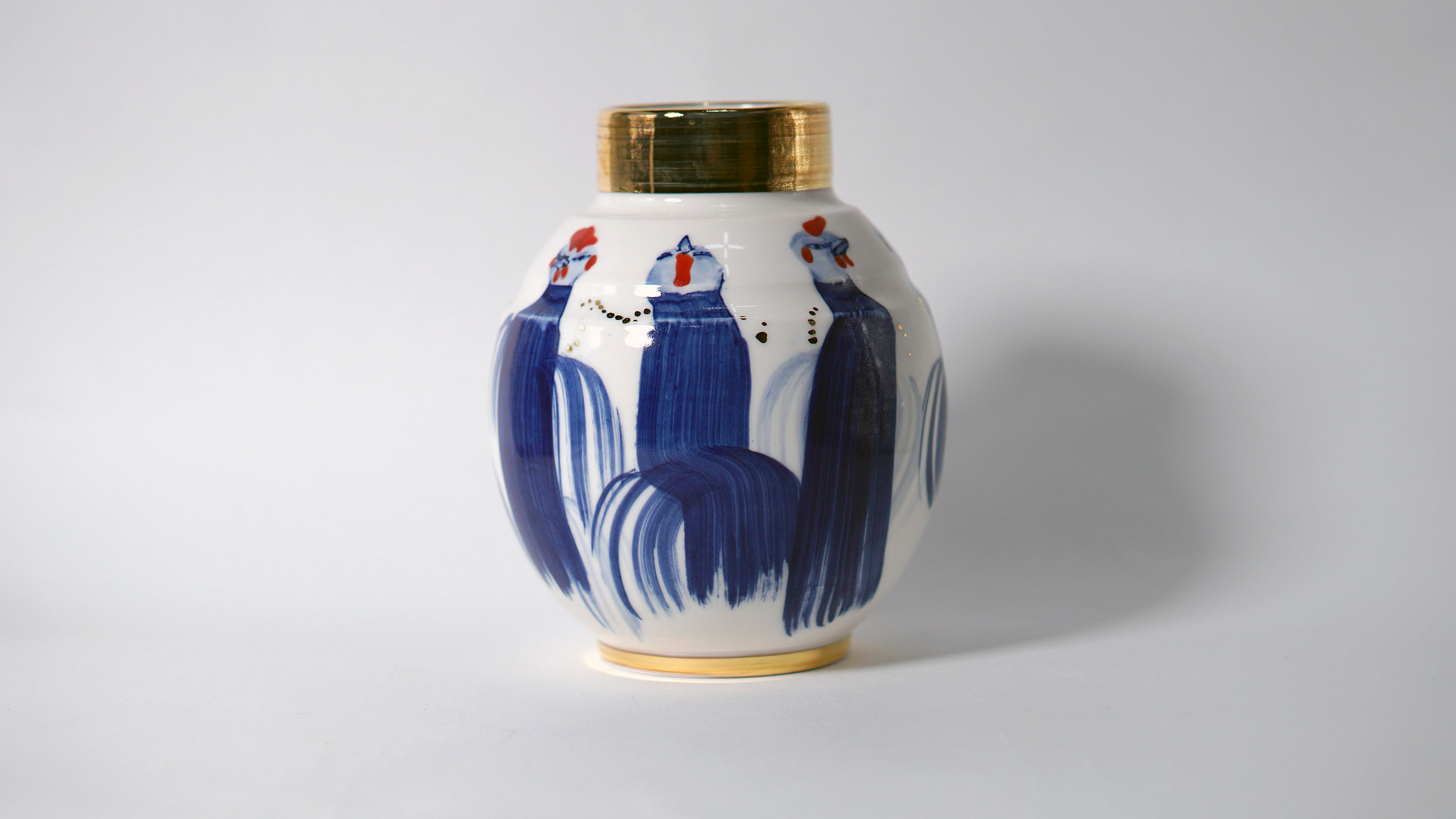 The Moon and Chickens vases are living objects where you can enjoy humorous expressions and playful movements of the chickens. The vases are hand painted and come in a variety of sizes and forms, allowing you to place one or more of them together to make your space even more unique.
