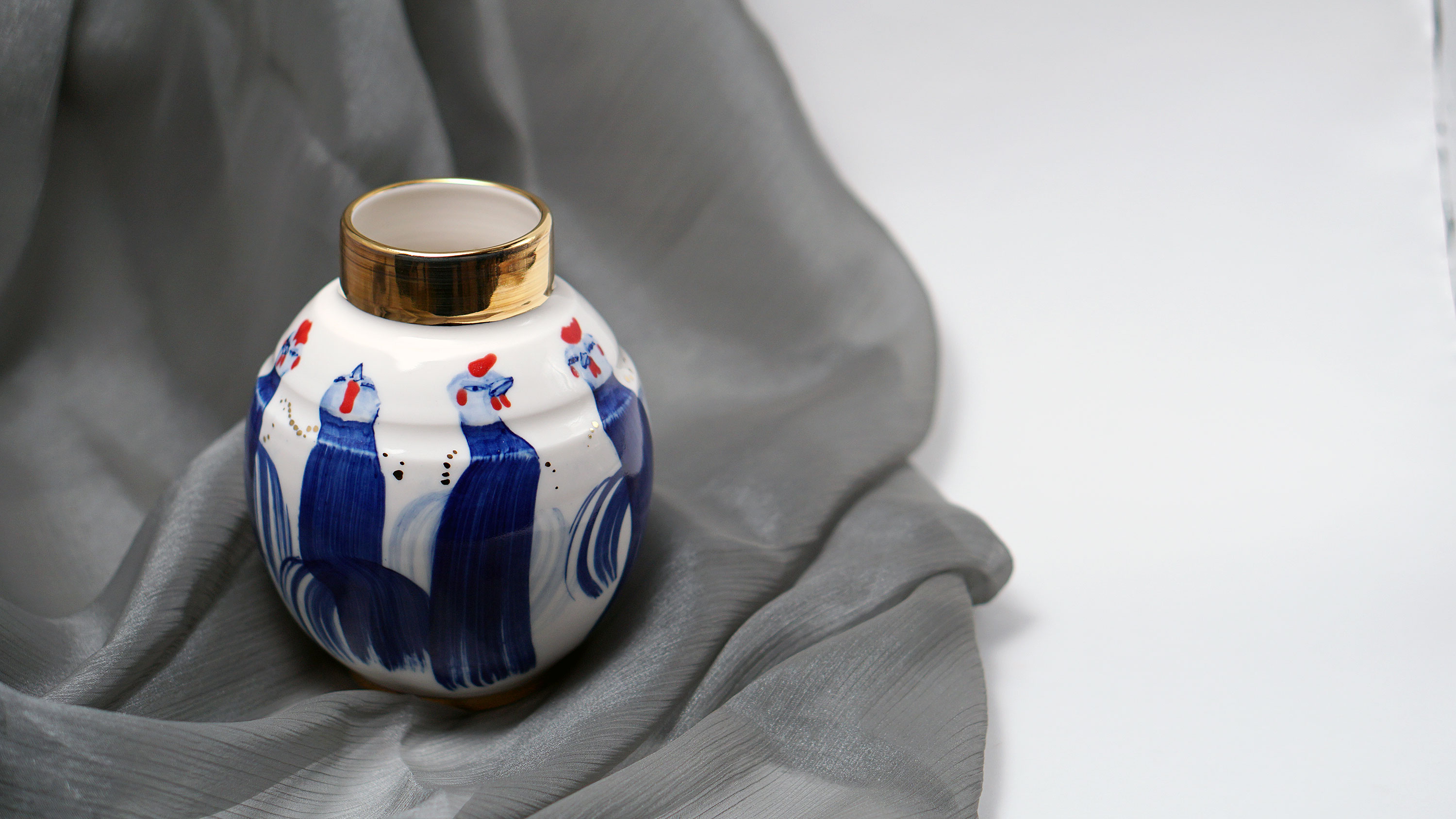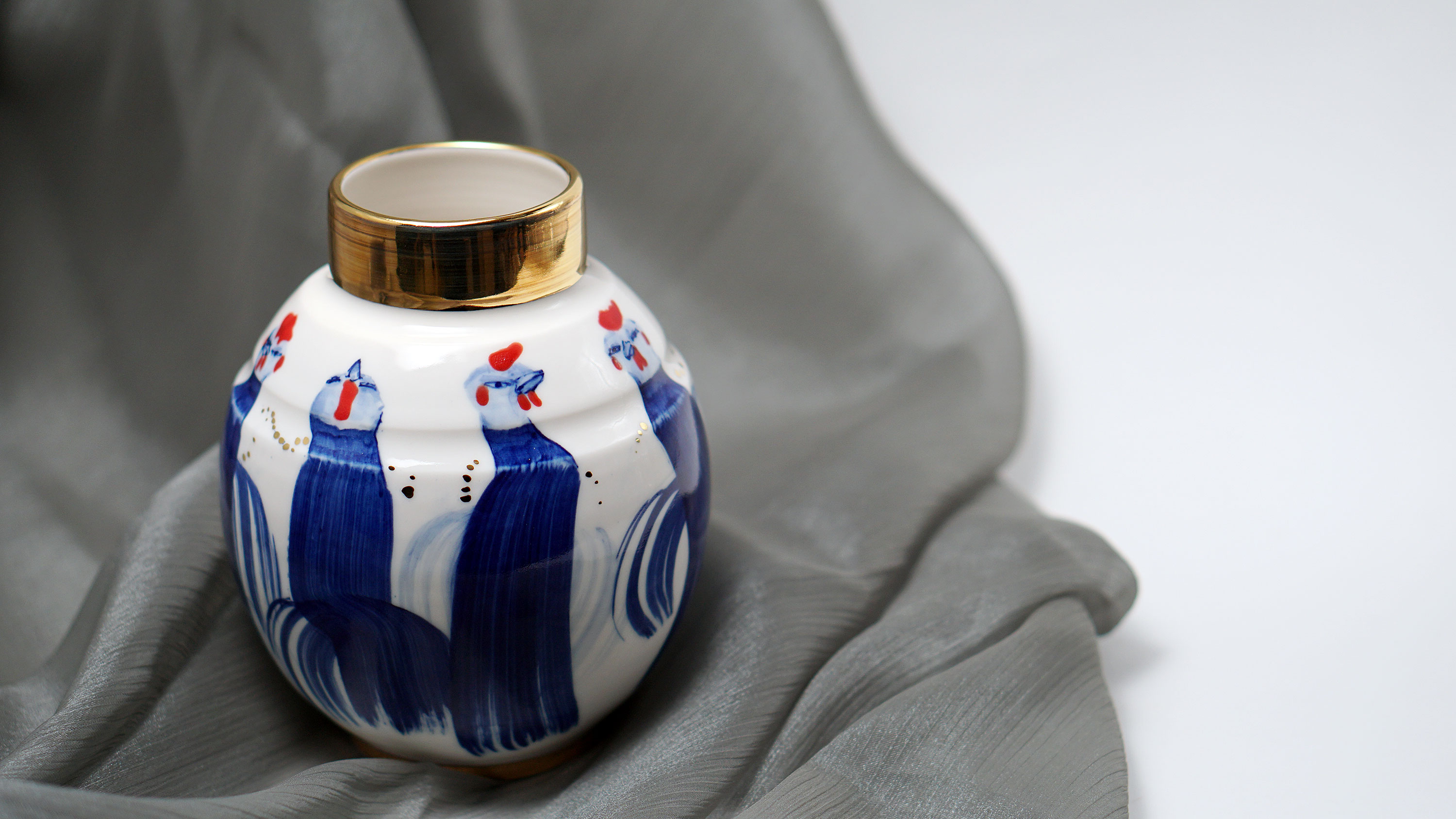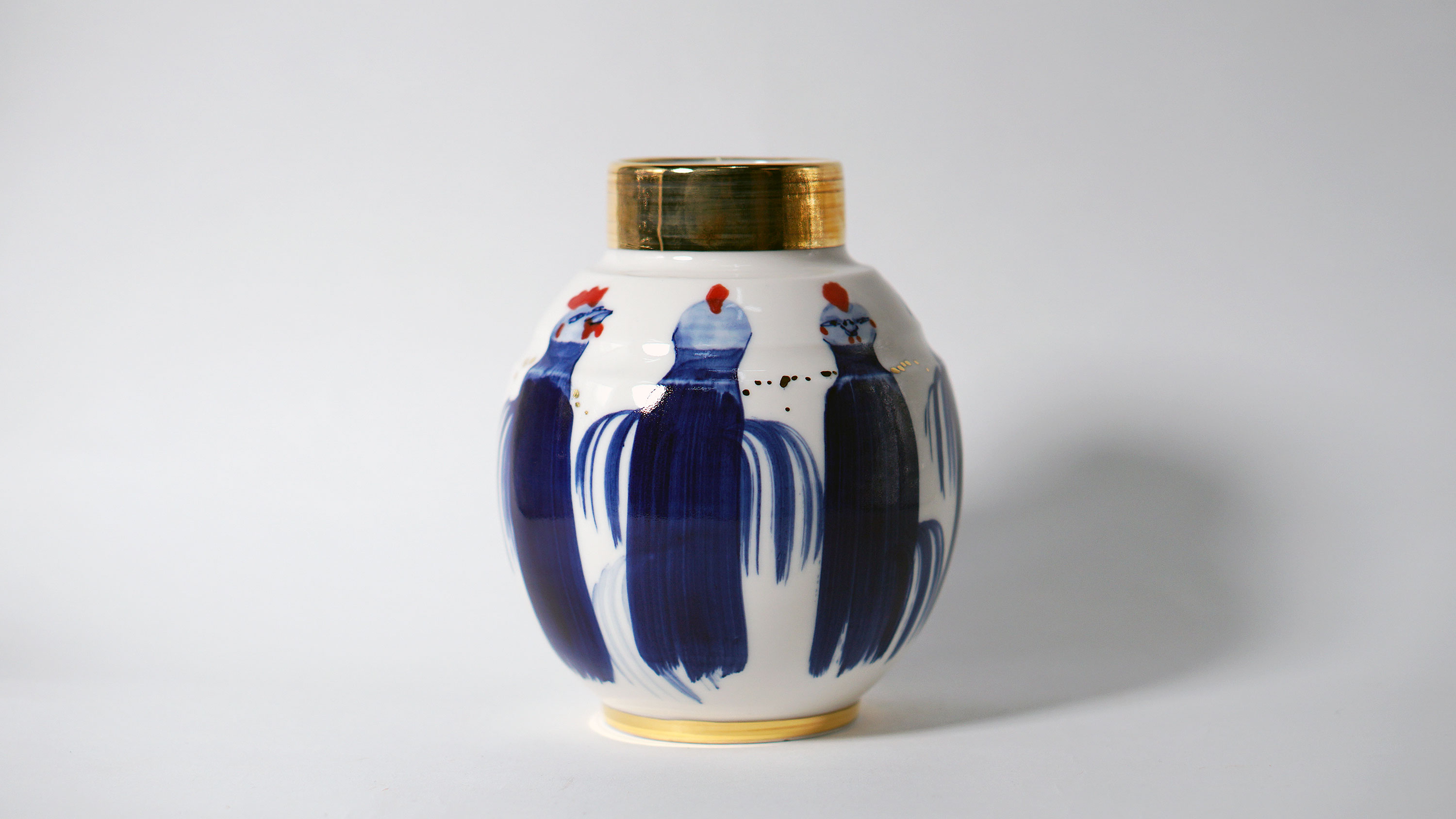 The Moon and Chickens vases are living objects where you can enjoy humorous expressions and playful movements of the chickens. The vases are hand painted and come in a variety of sizes and forms, allowing you to place one or more of them together to make your space even more unique.