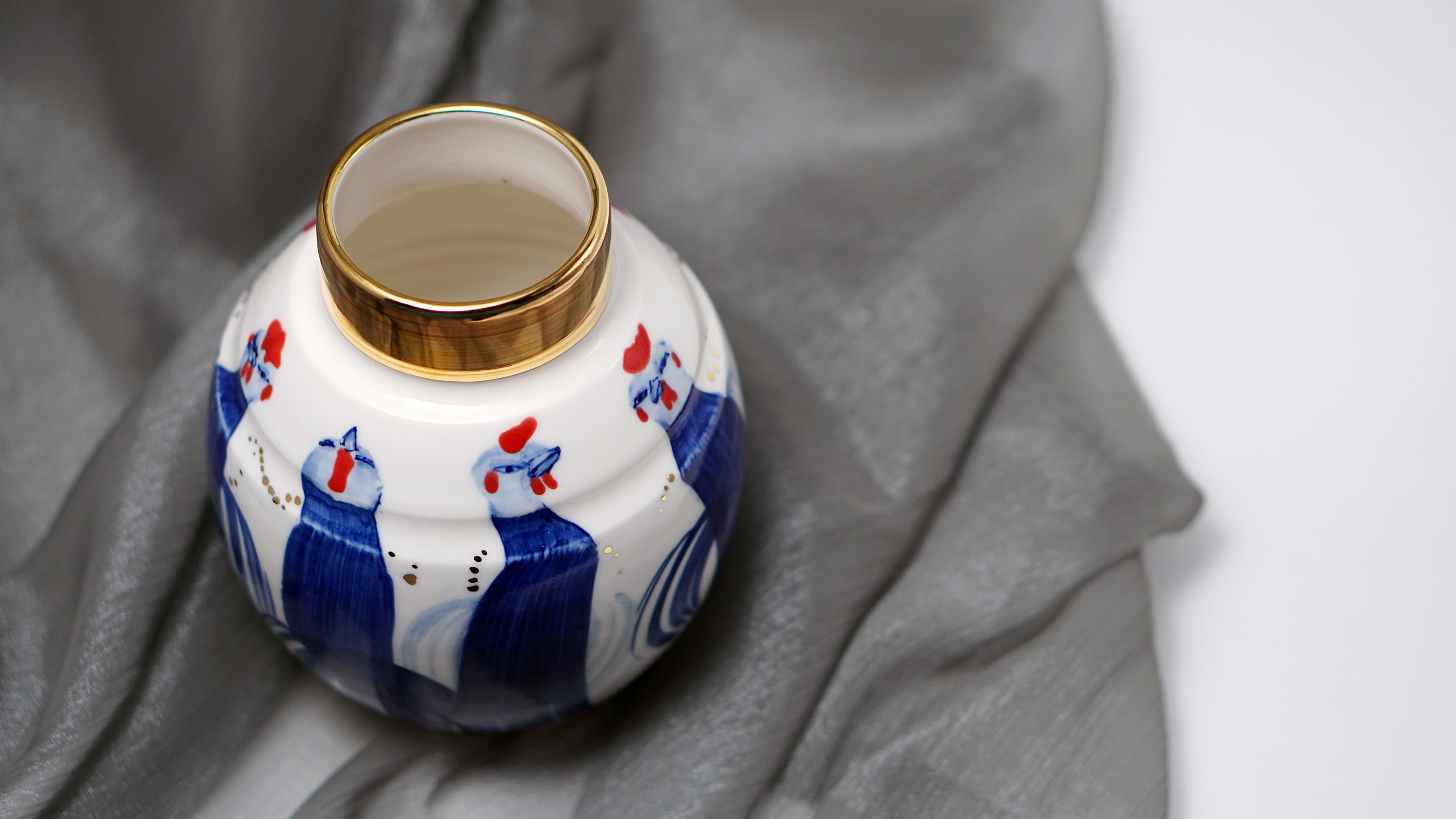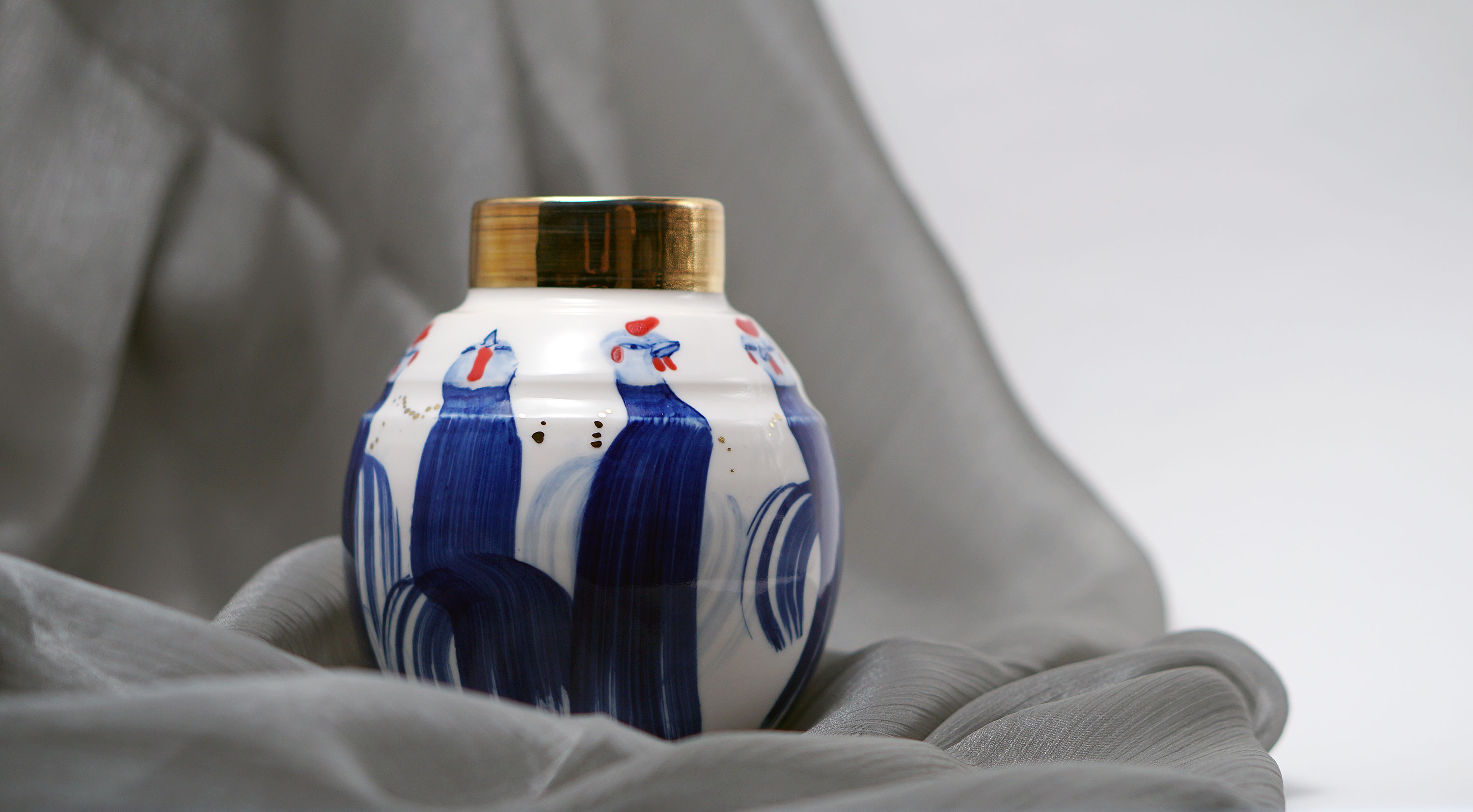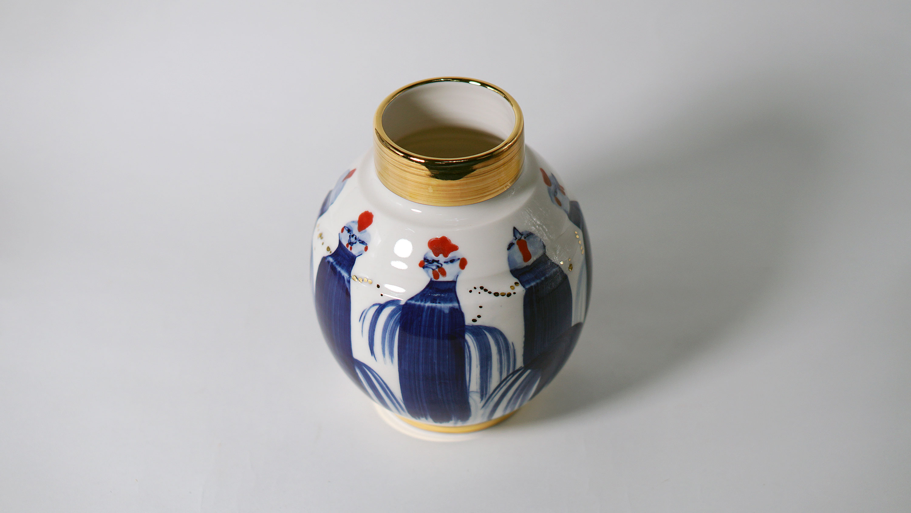 The Moon and Chickens vases are living objects where you can enjoy humorous expressions and playful movements of the chickens. The vases are hand painted and come in a variety of sizes and forms, allowing you to place one or more of them together to make your space even more unique.