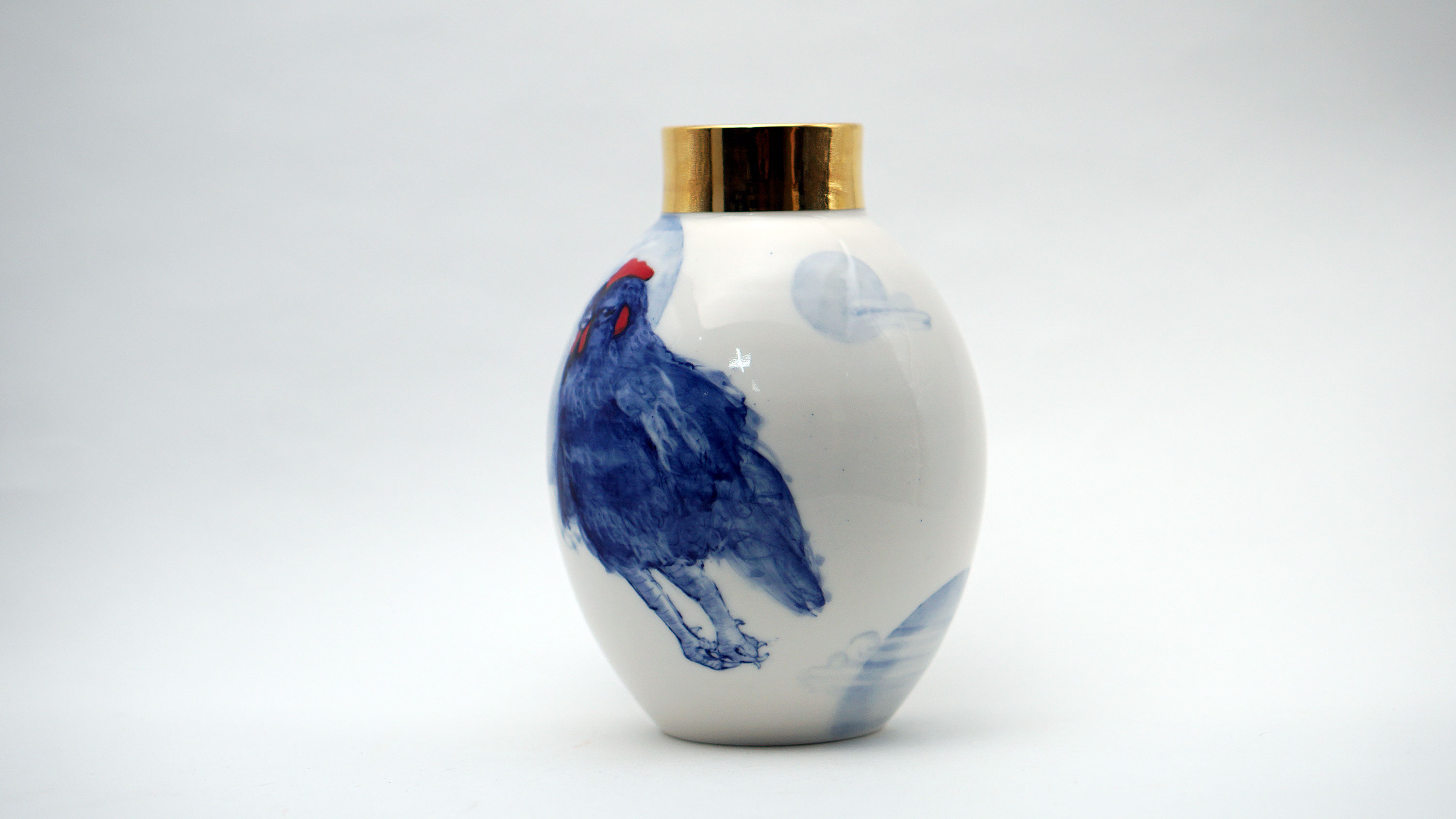 The Moon and Chickens vases are living objects where you can enjoy humorous expressions and playful movements of the chickens. The vases are hand painted and come in a variety of sizes and forms, allowing you to place one or more of them together to make your space even more unique.