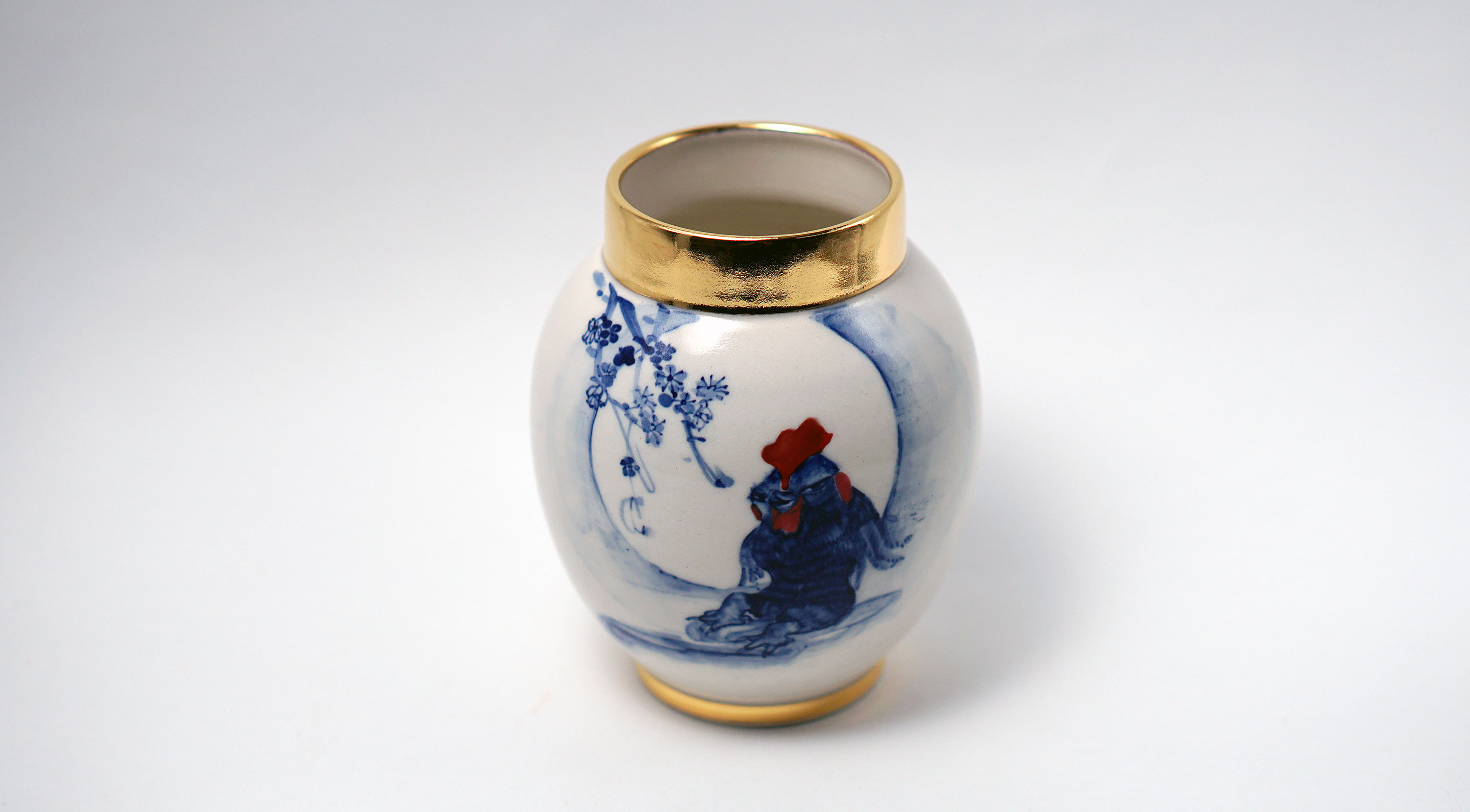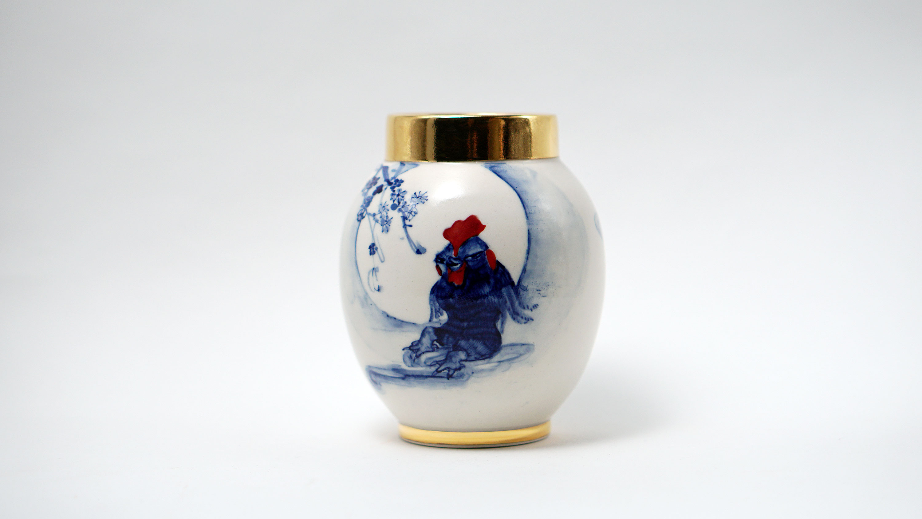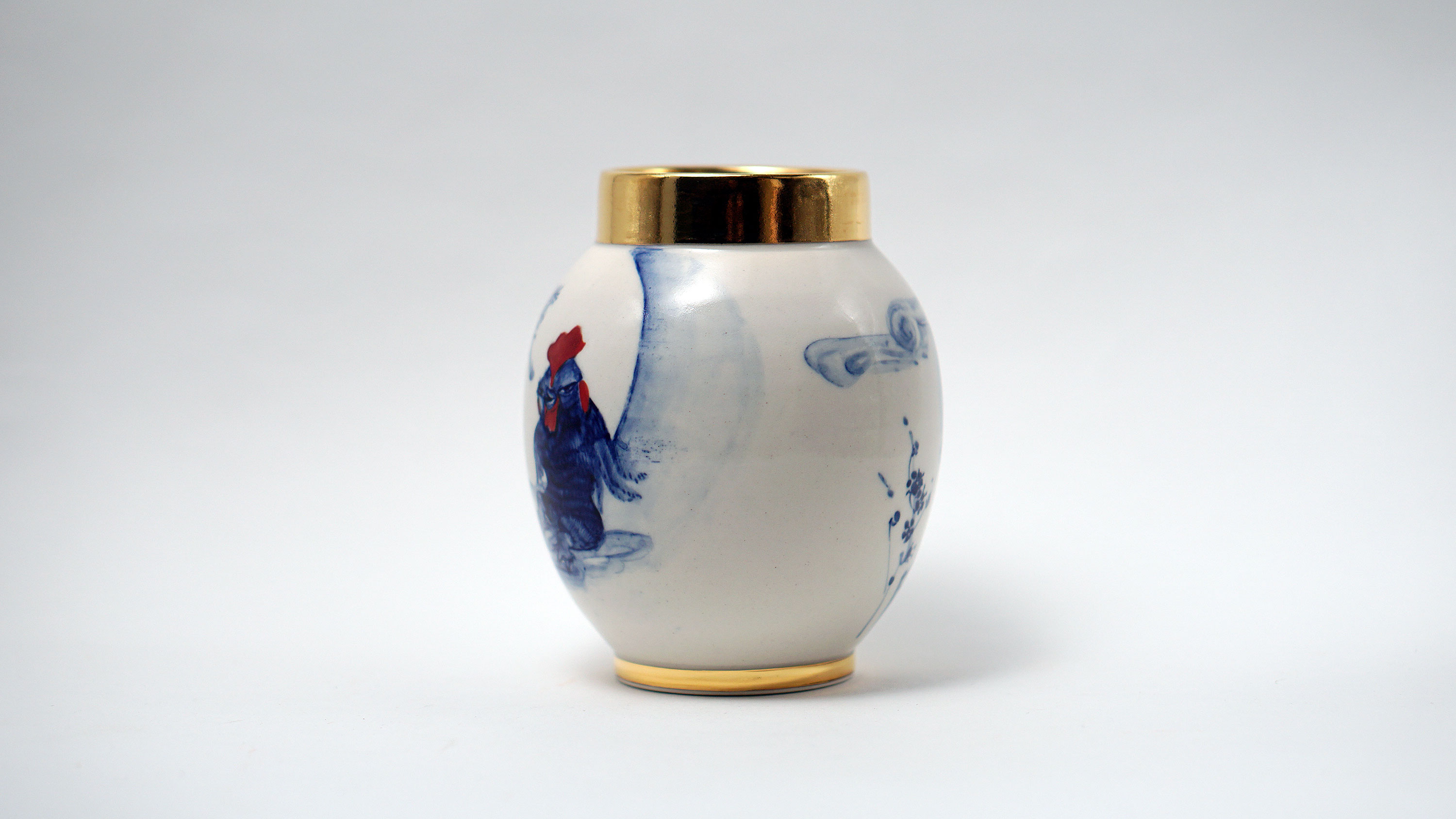 The Moon and Chickens vases are living objects where you can enjoy humorous expressions and playful movements of the chickens. The vases are hand painted and come in a variety of sizes and forms, allowing you to place one or more of them together to make your space even more unique.