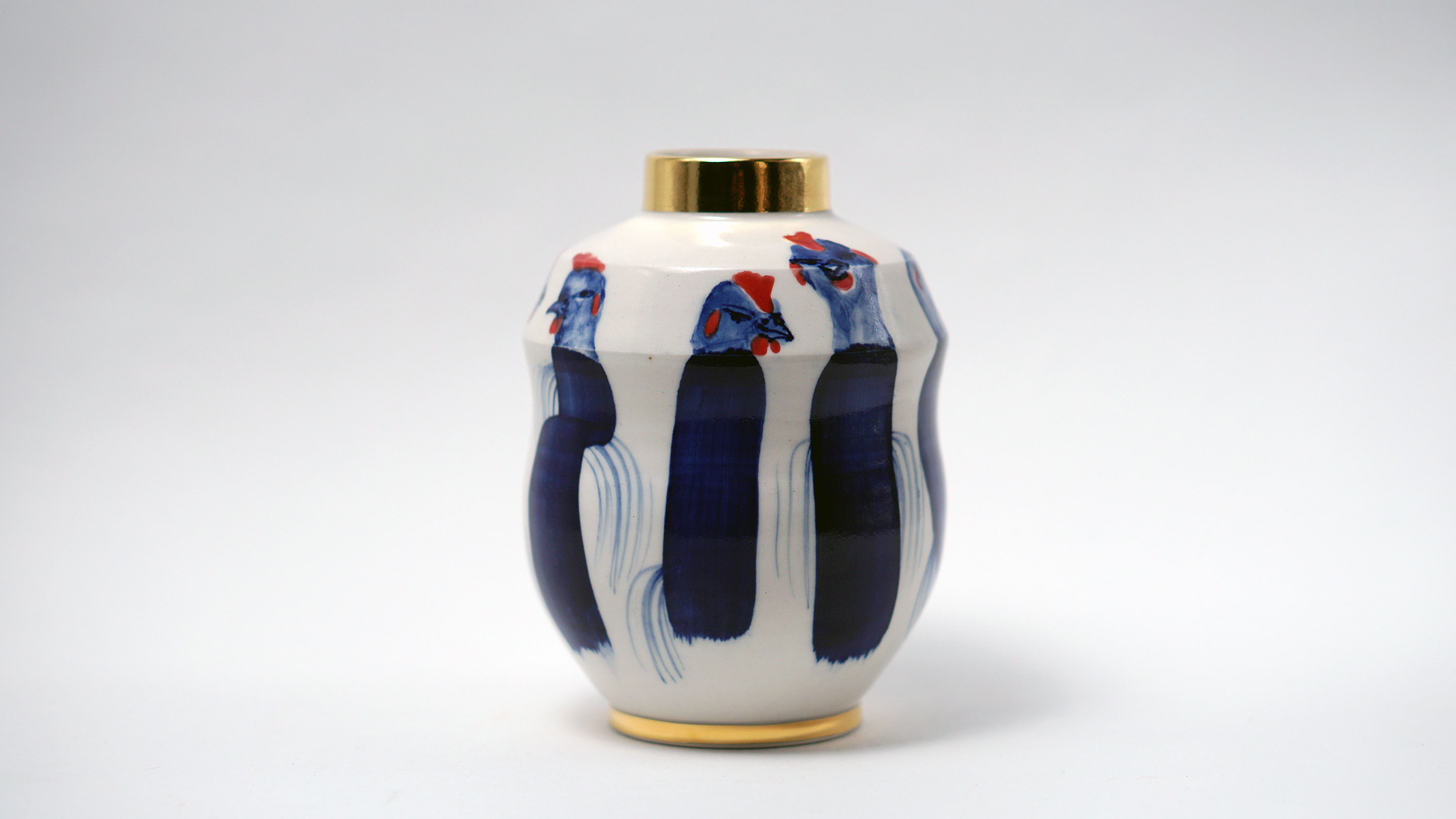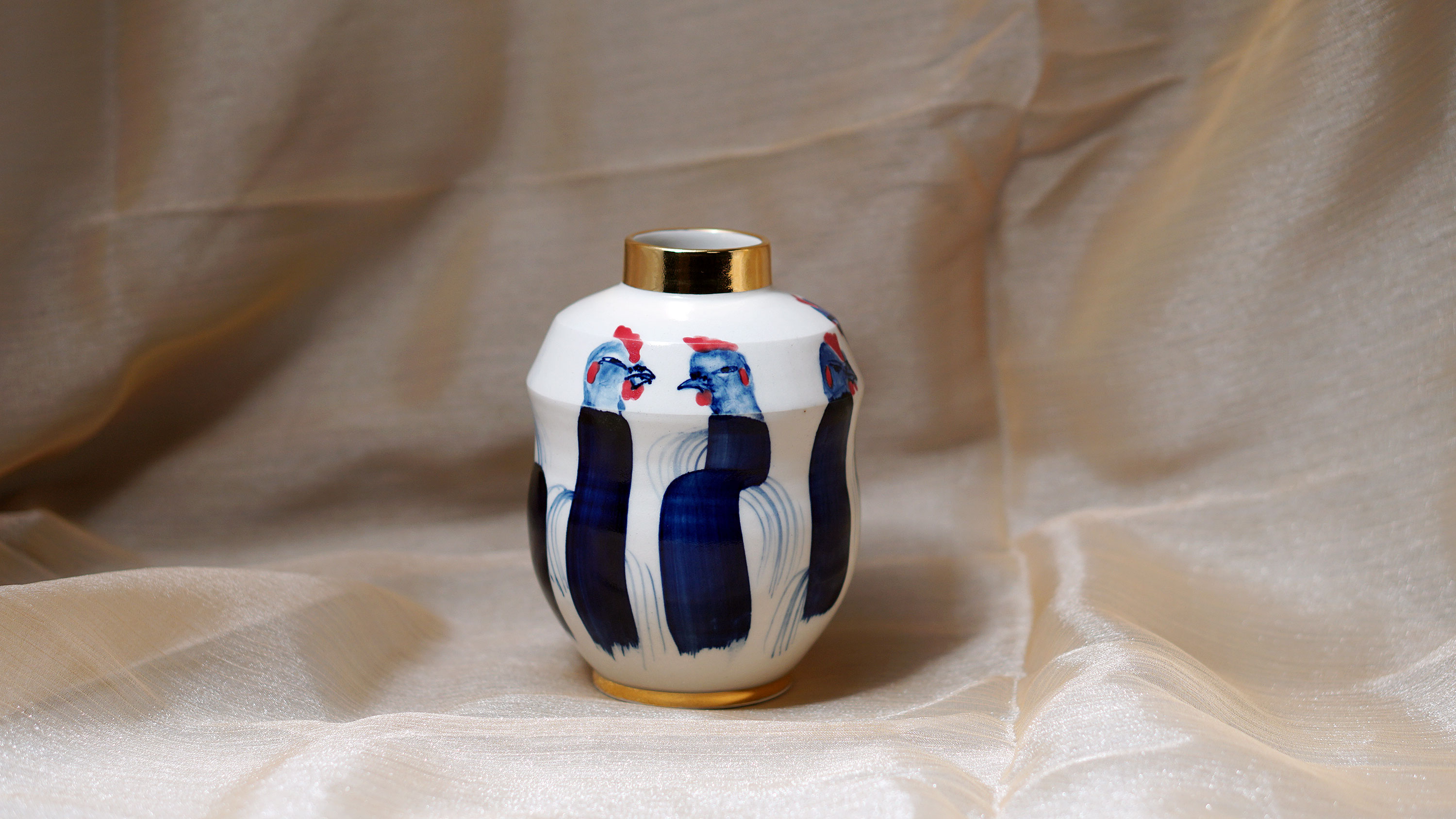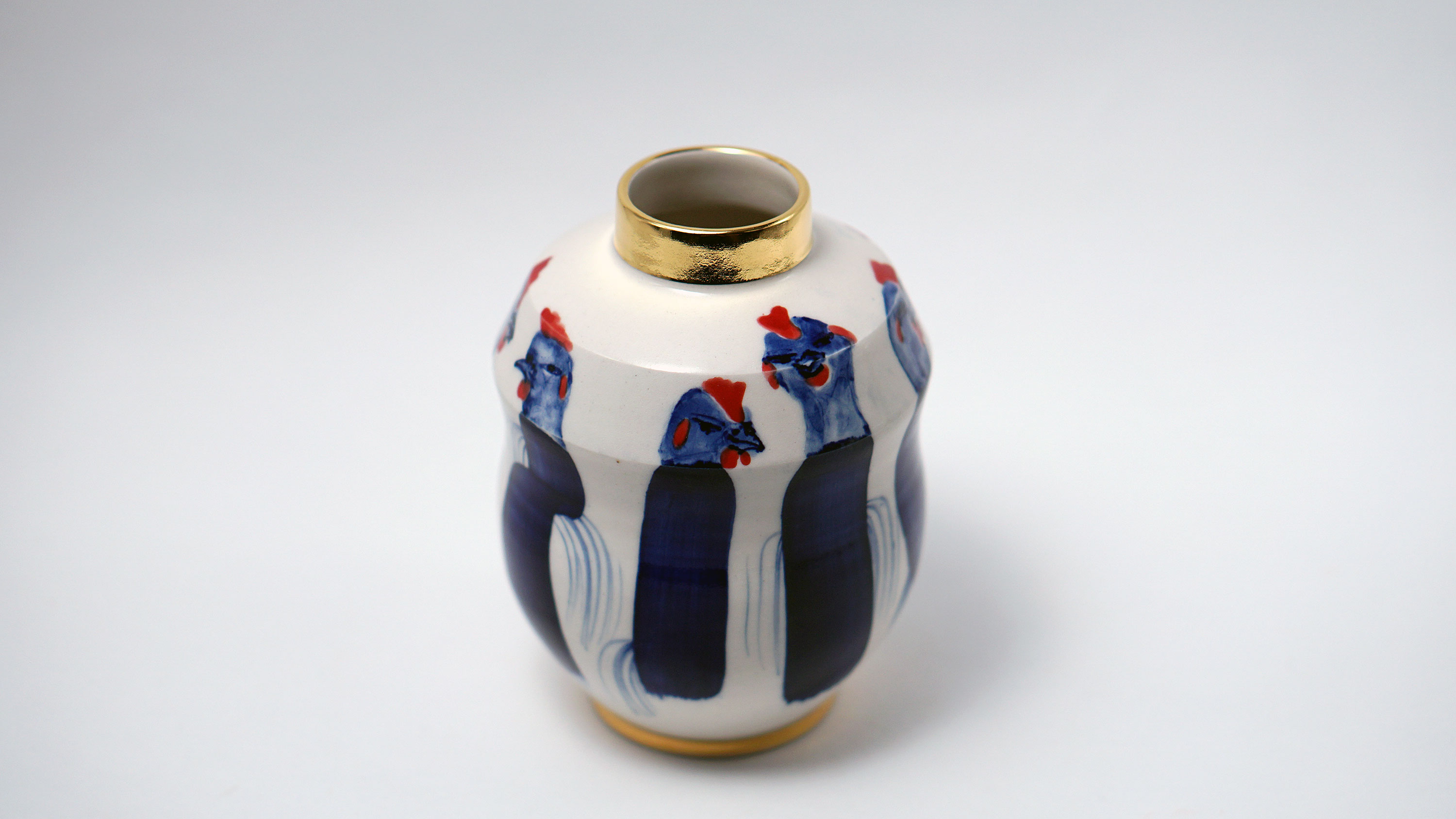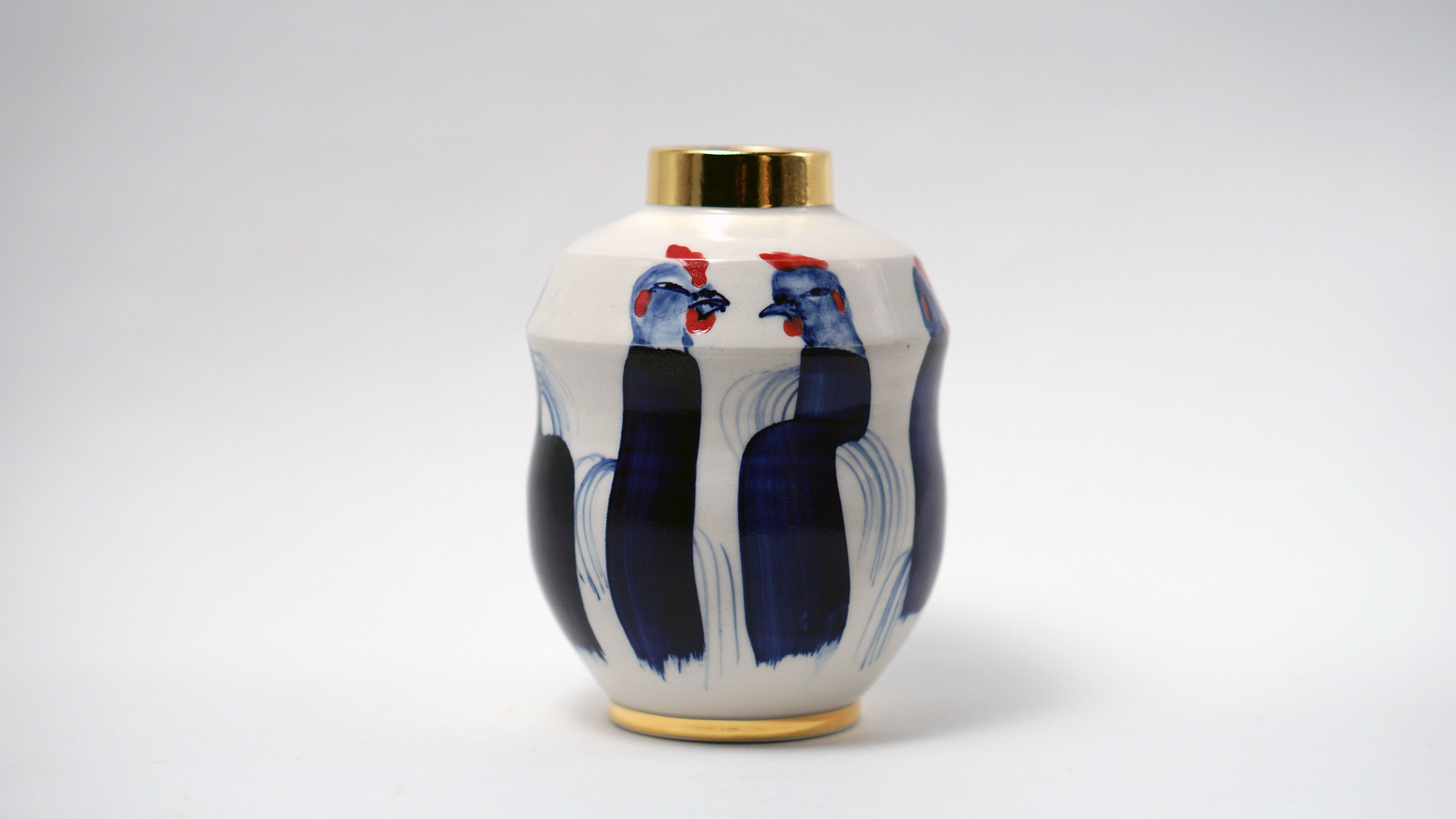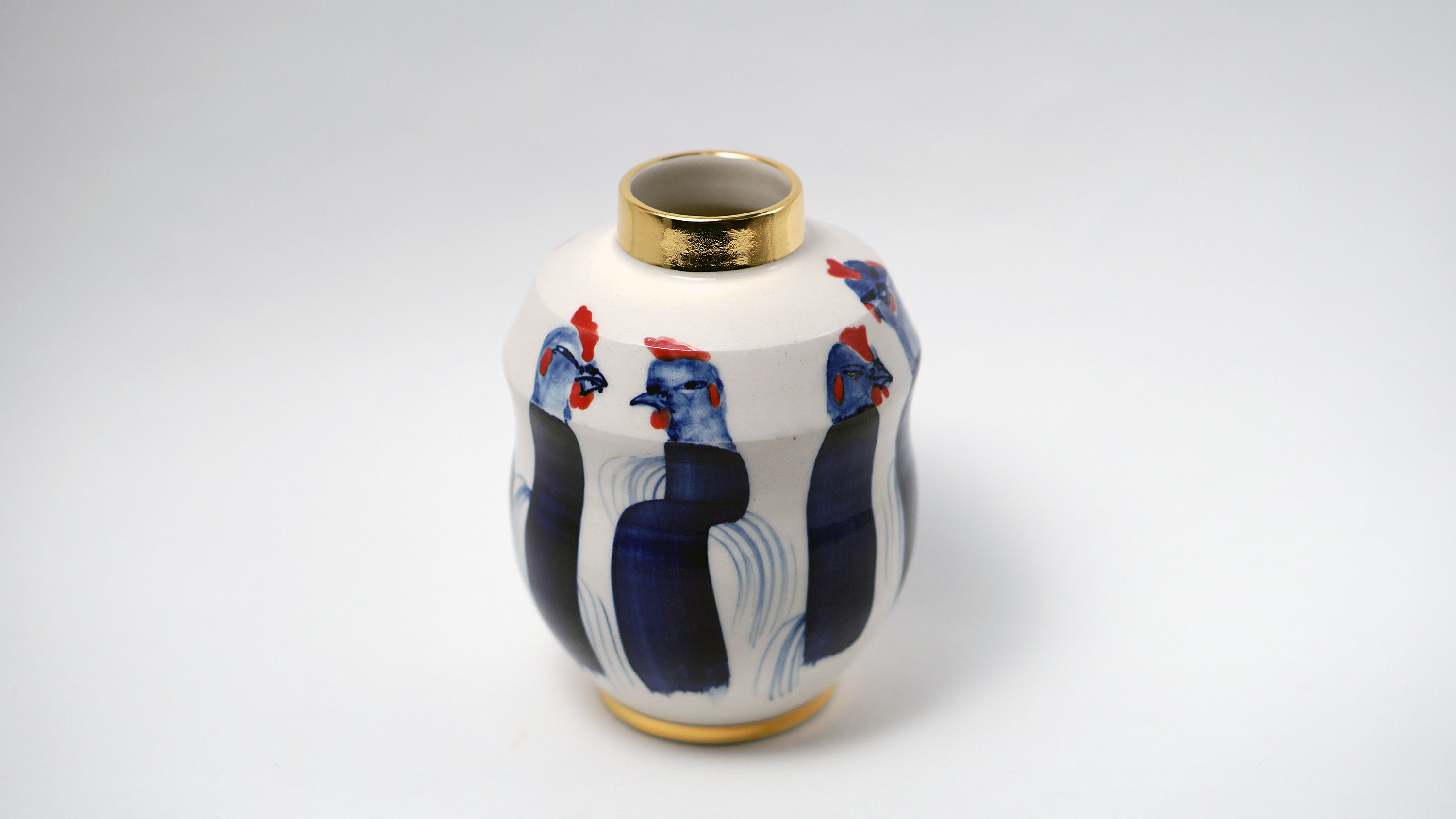 The Moon and Chickens vases are living objects where you can enjoy humorous expressions and playful movements of the chickens. The vases are hand painted and come in a variety of sizes and forms, allowing you to place one or more of them together to make your space even more unique.