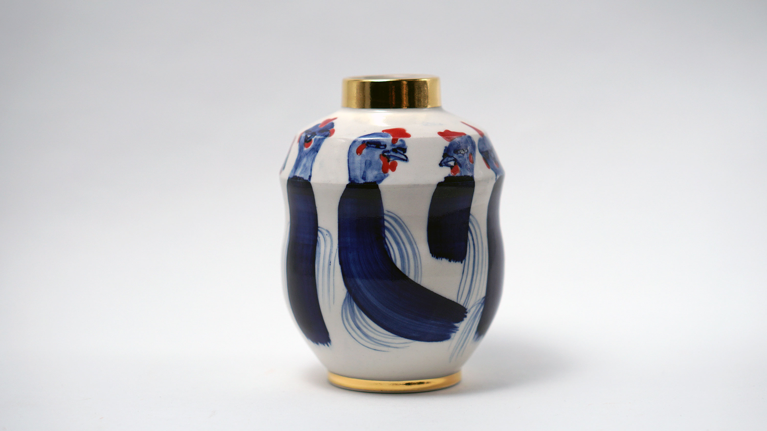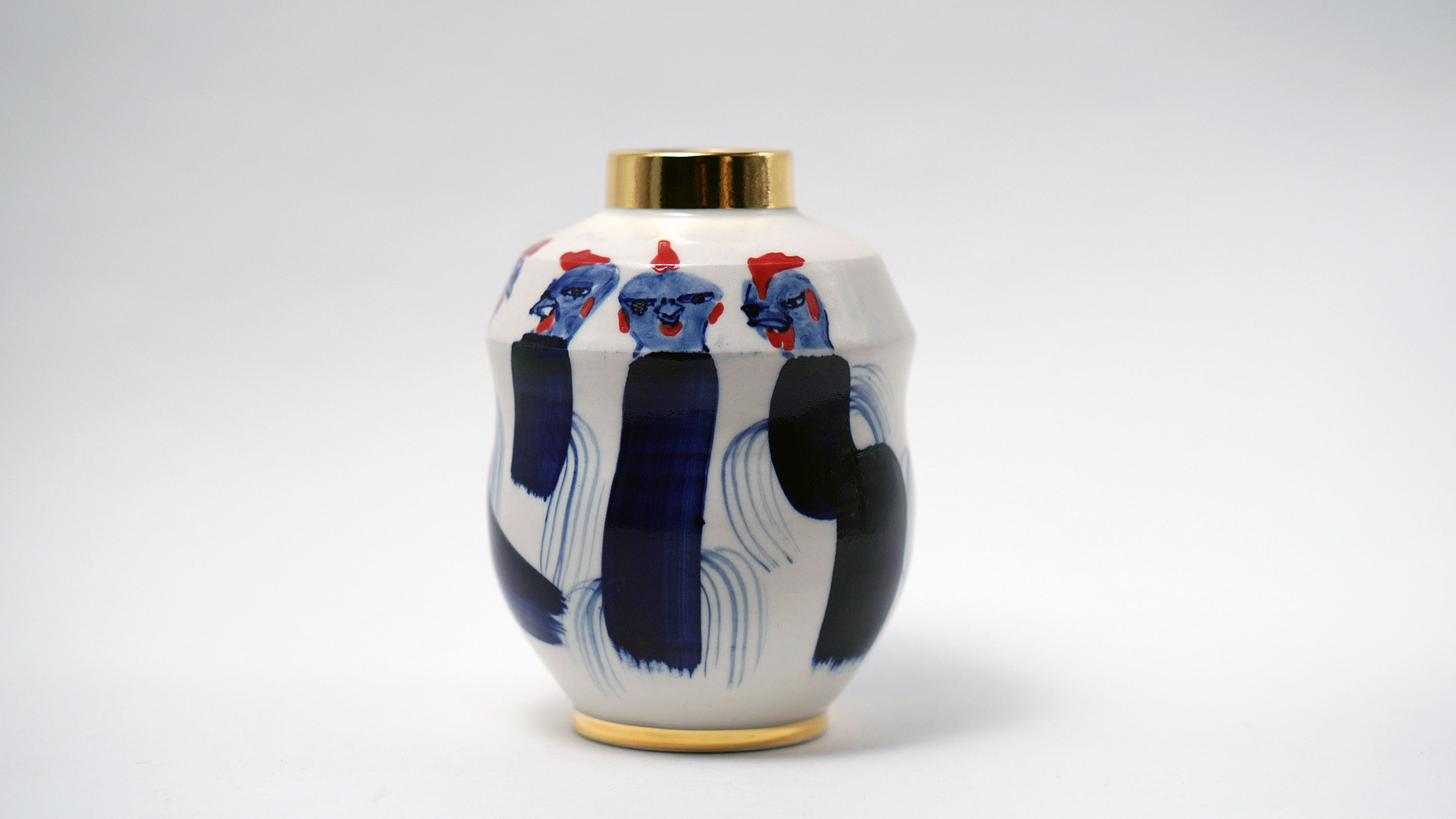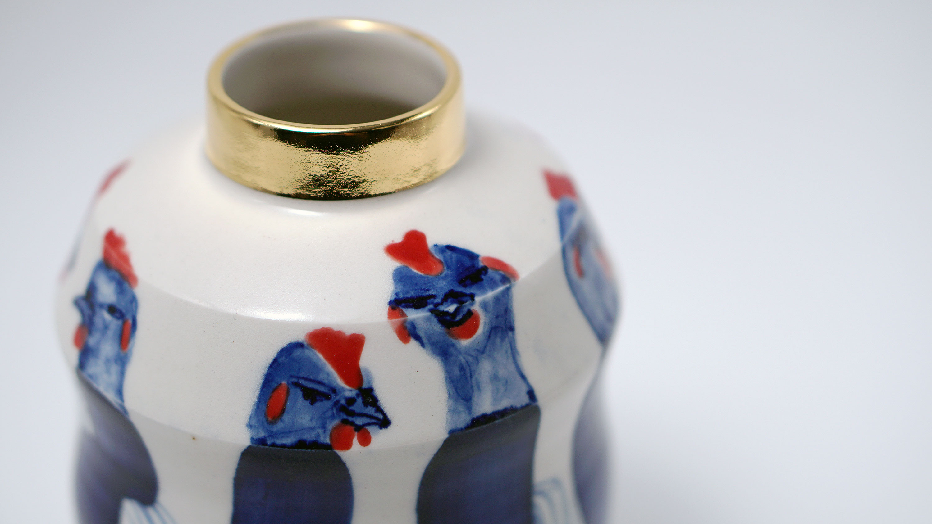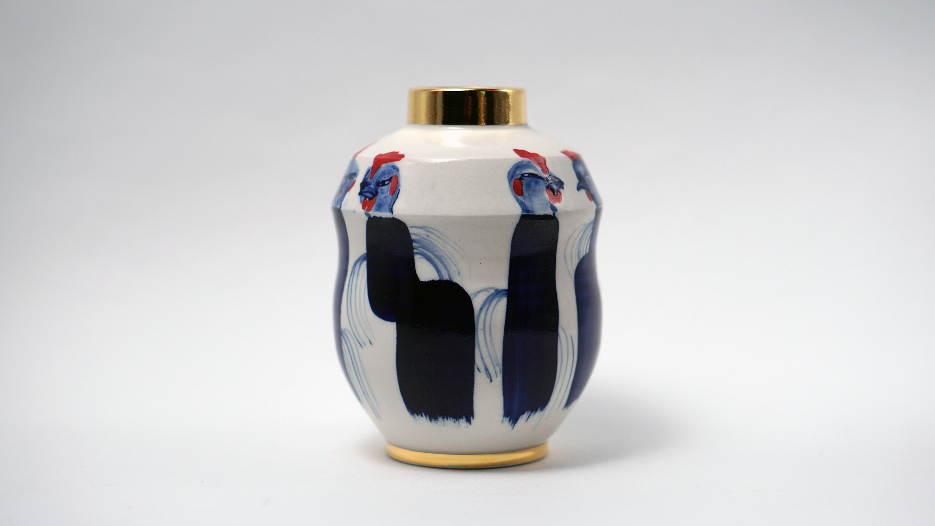 The Moon and Chickens vases are living objects where you can enjoy humorous expressions and playful movements of the chickens. The vases are hand painted and come in a variety of sizes and forms, allowing you to place one or more of them together to make your space even more unique.