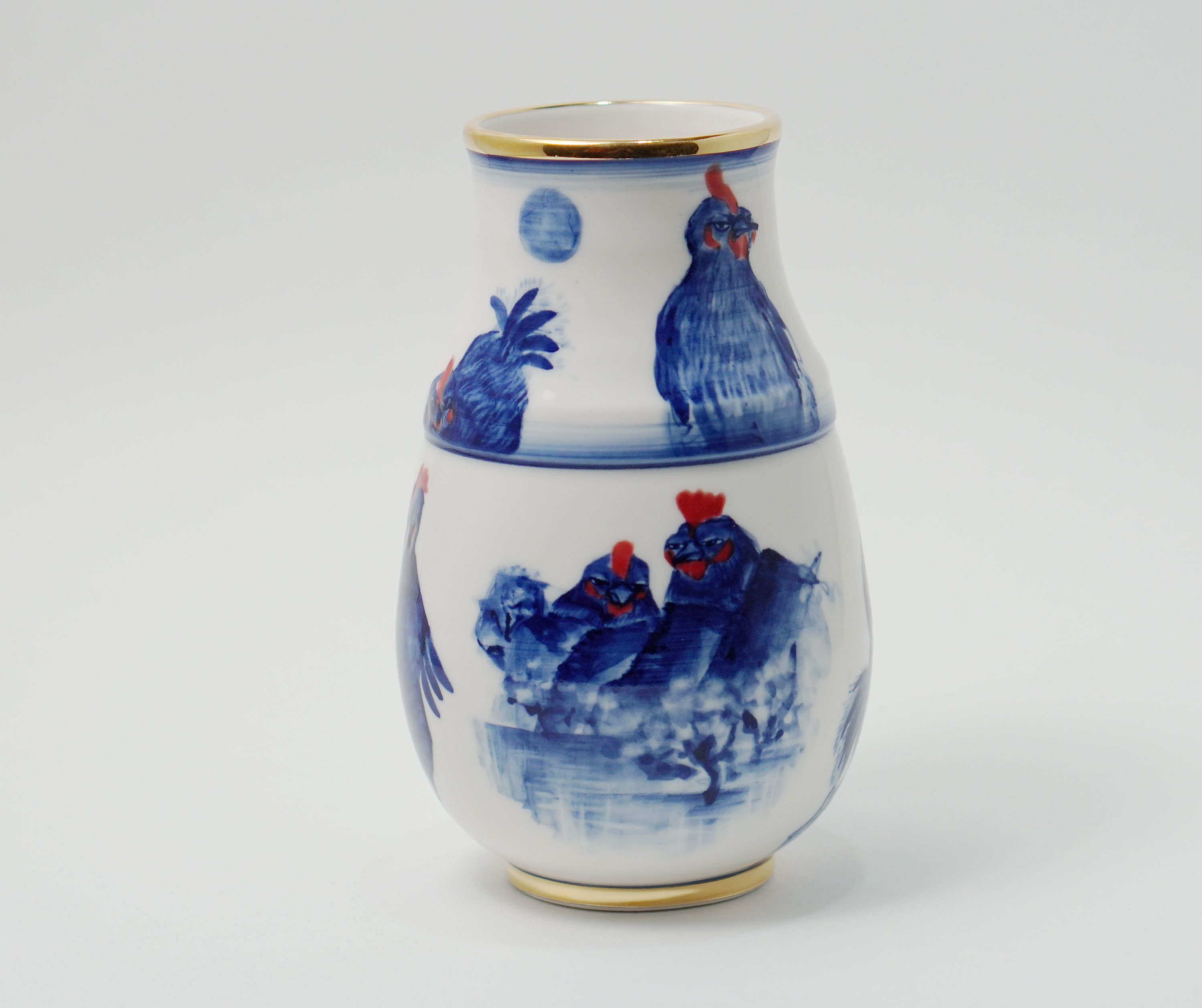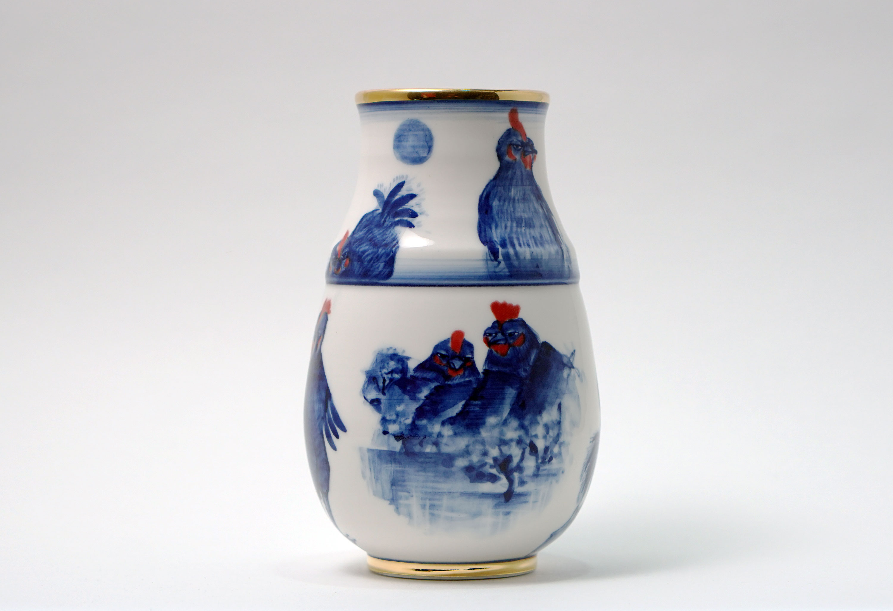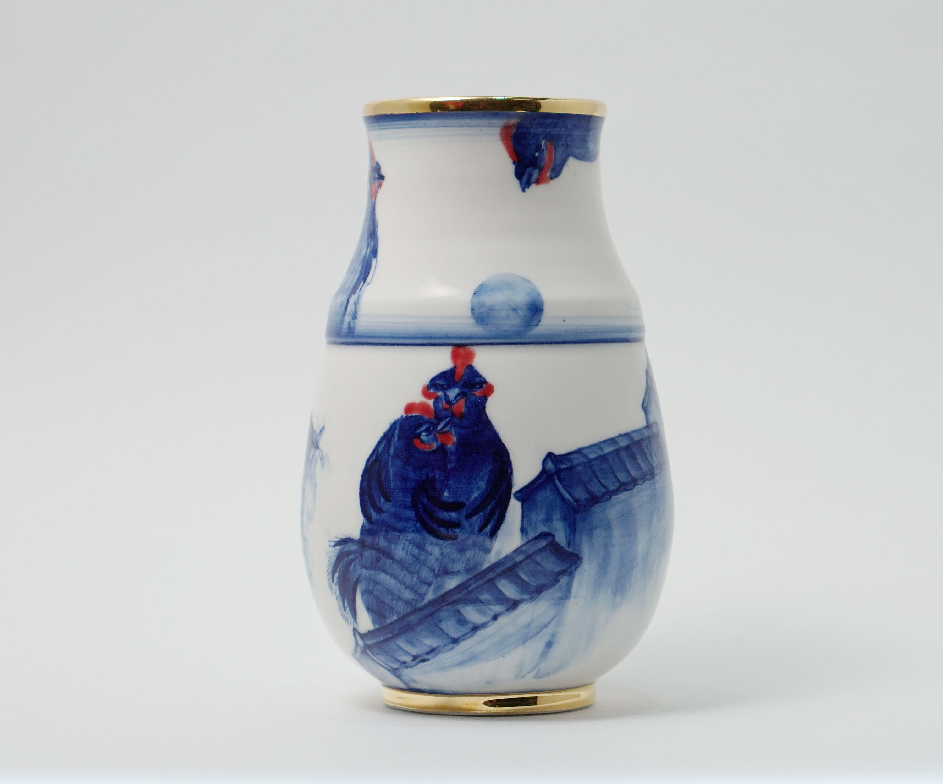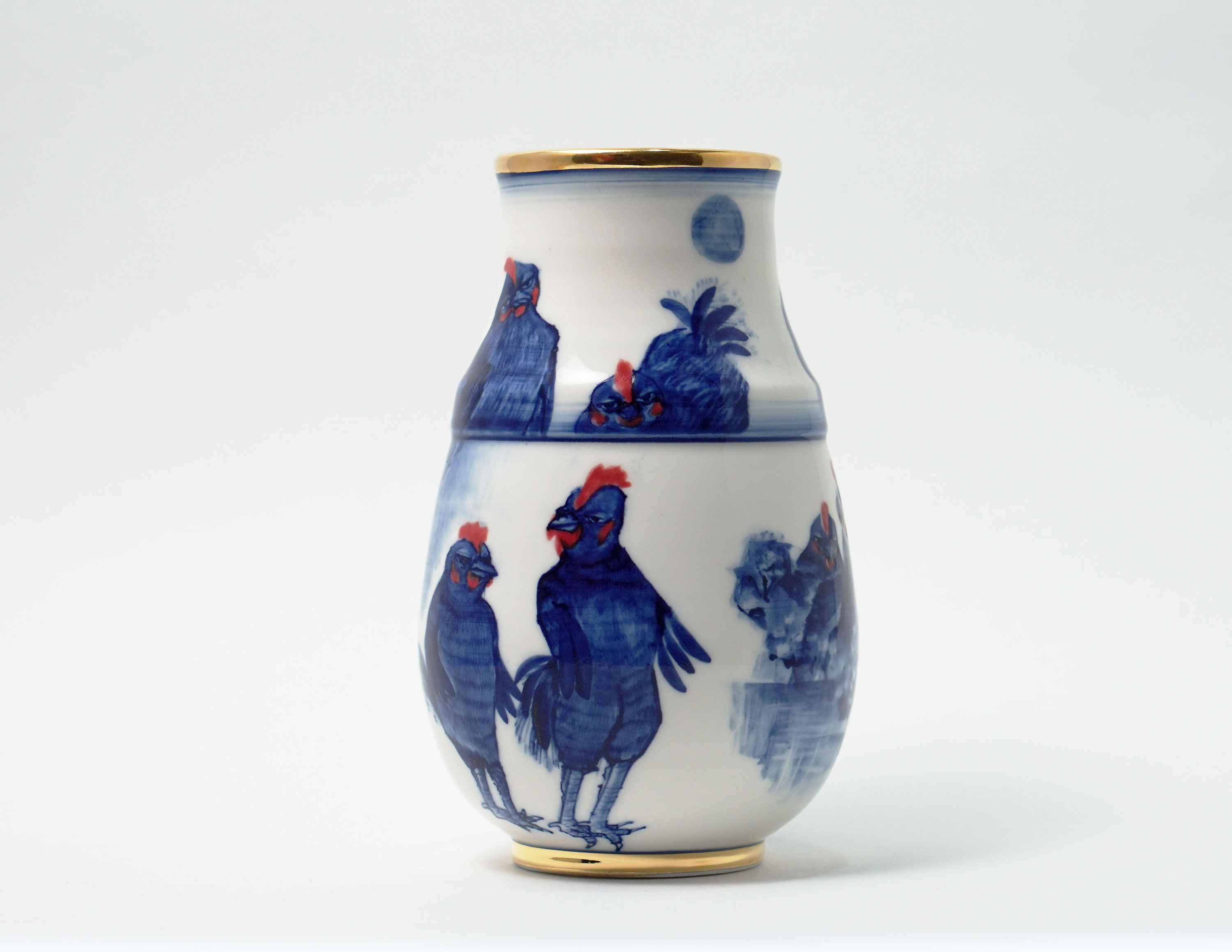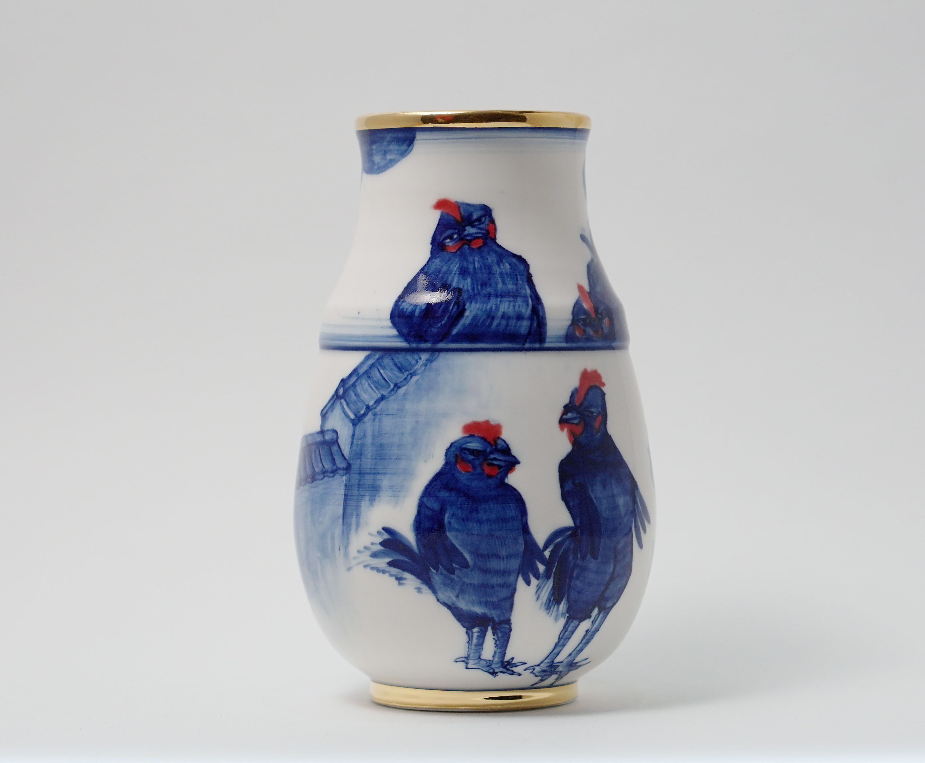 The Moon and Chickens vases are living objects where you can enjoy humorous expressions and playful movements of the chickens. The vases are hand painted and come in a variety of sizes and forms, allowing you to place one or more of them together to make your space even more unique.
