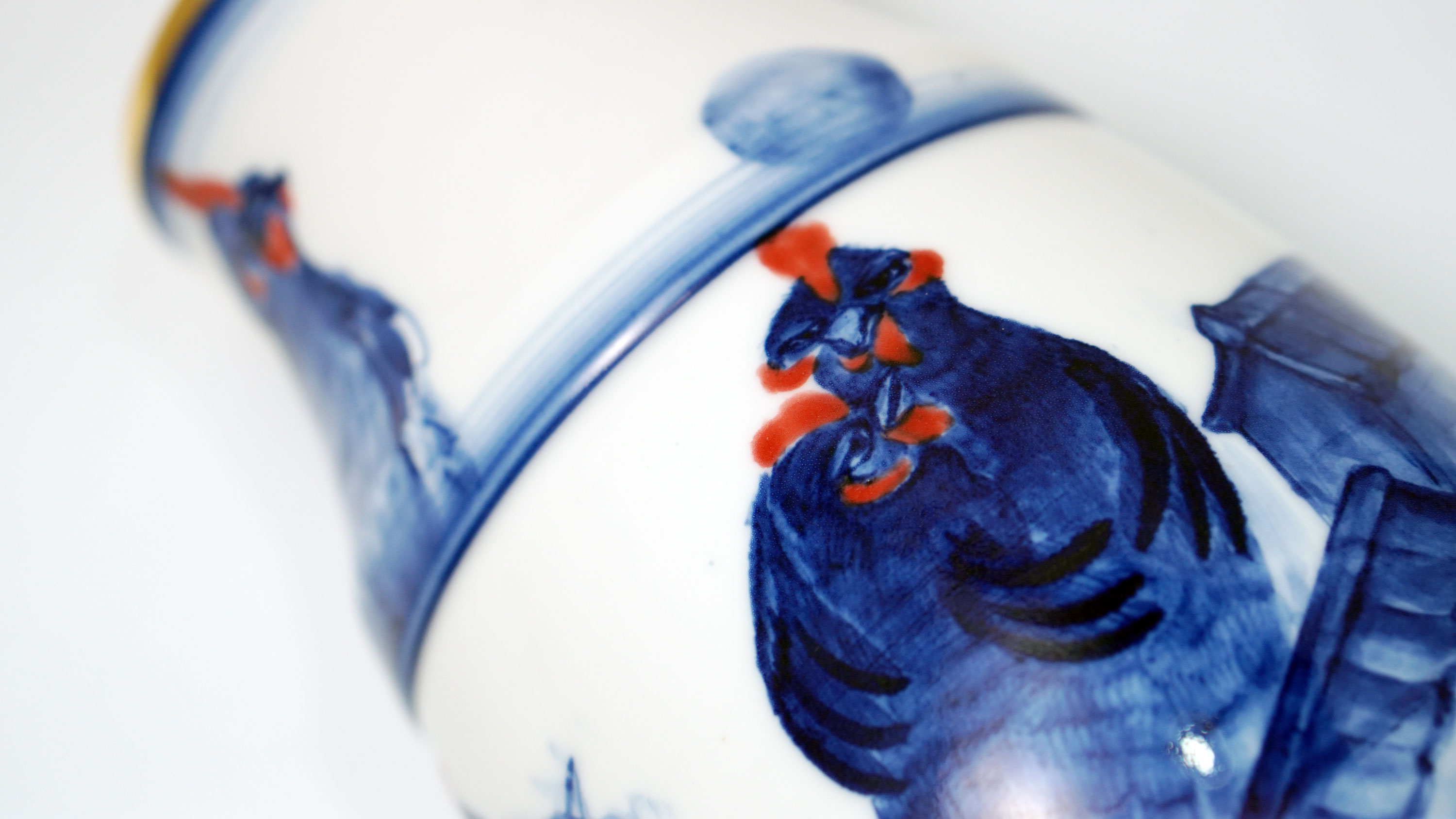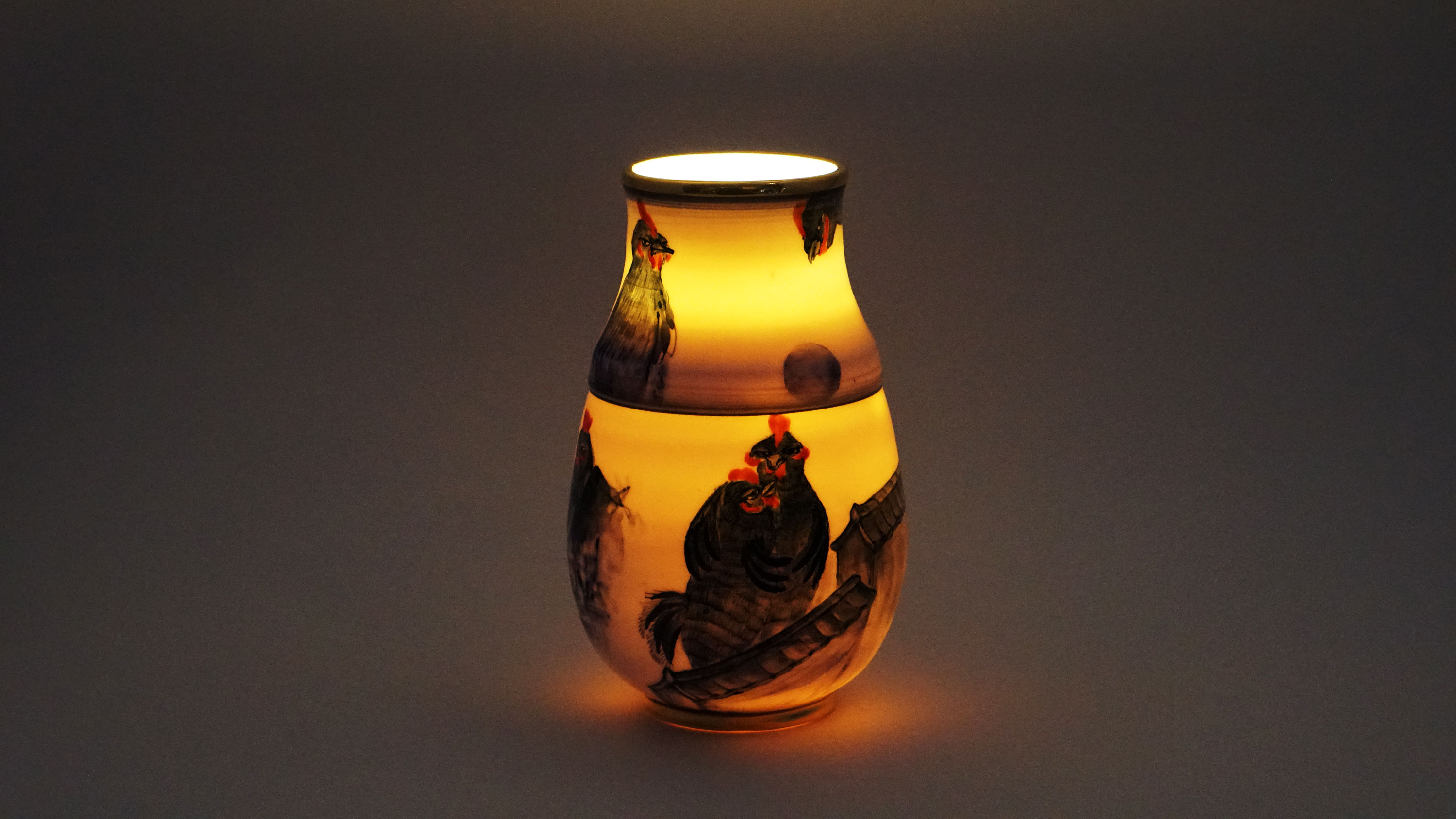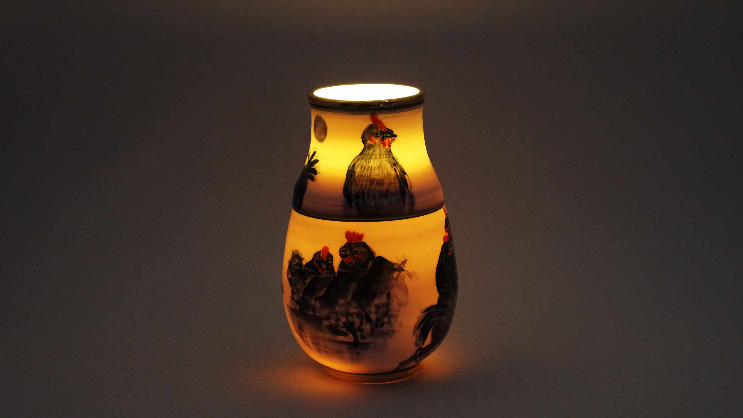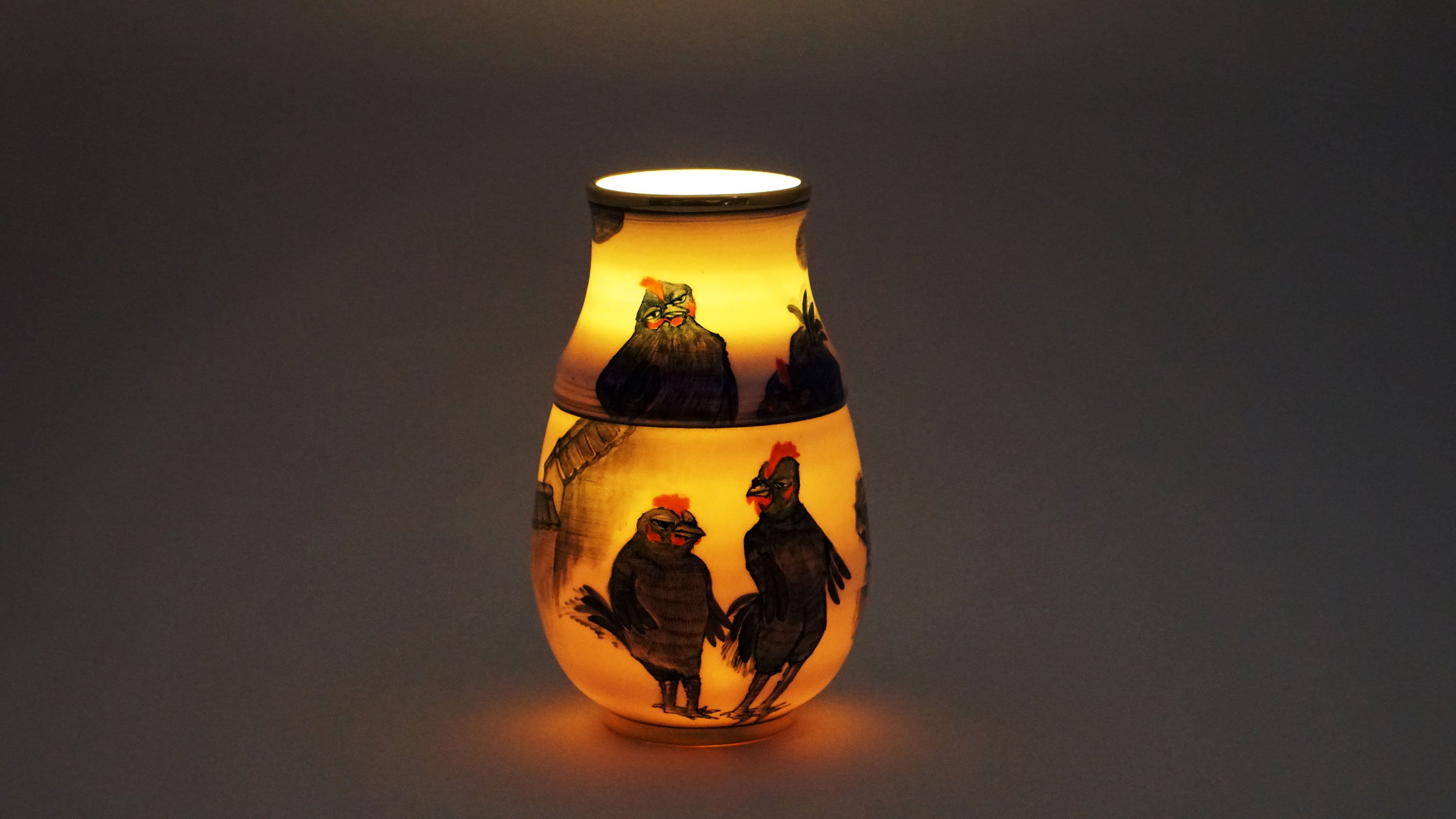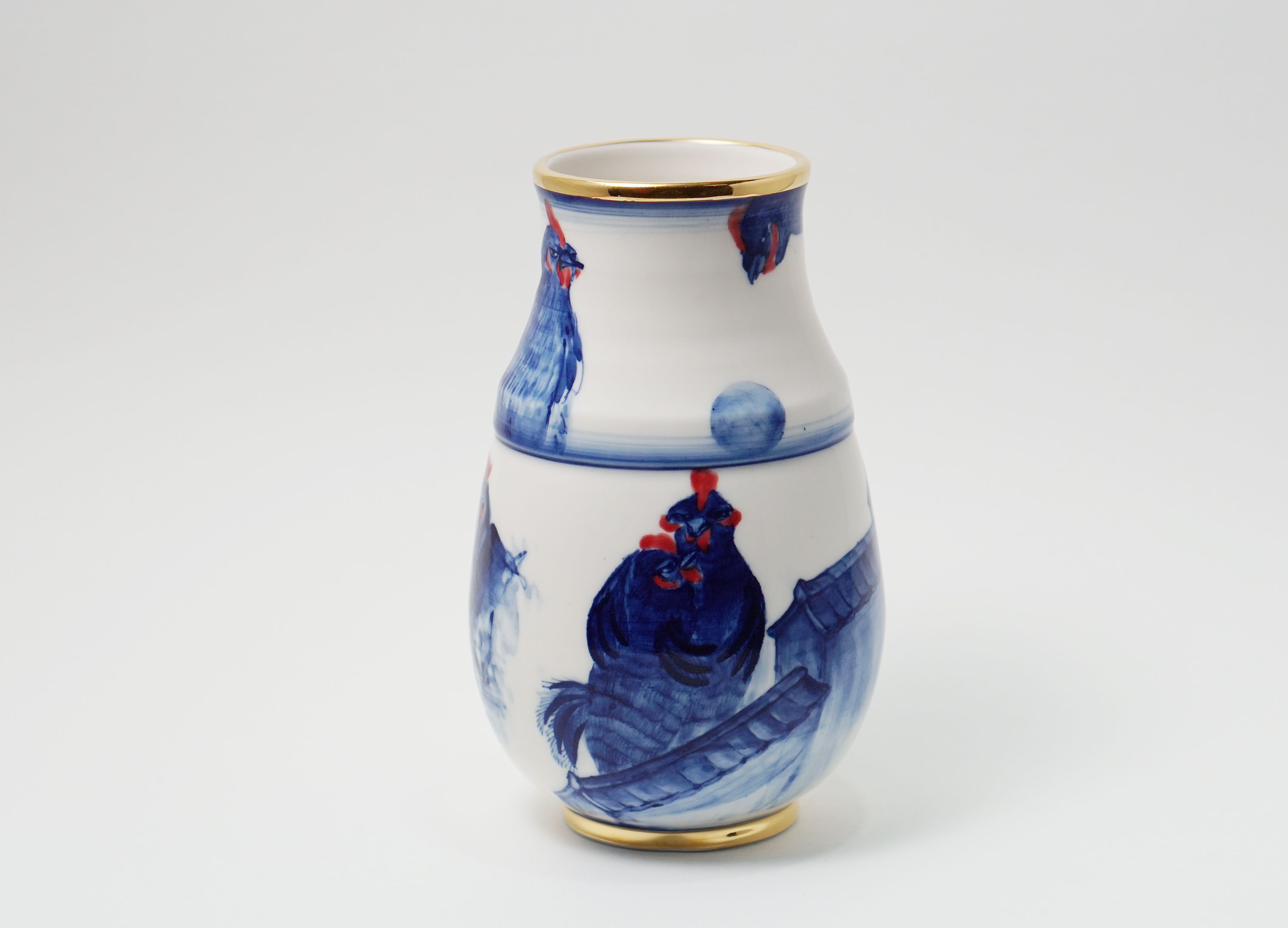 The Moon and Chickens vases are living objects where you can enjoy humorous expressions and playful movements of the chickens. The vases are hand painted and come in a variety of sizes and forms, allowing you to place one or more of them together to make your space even more unique.