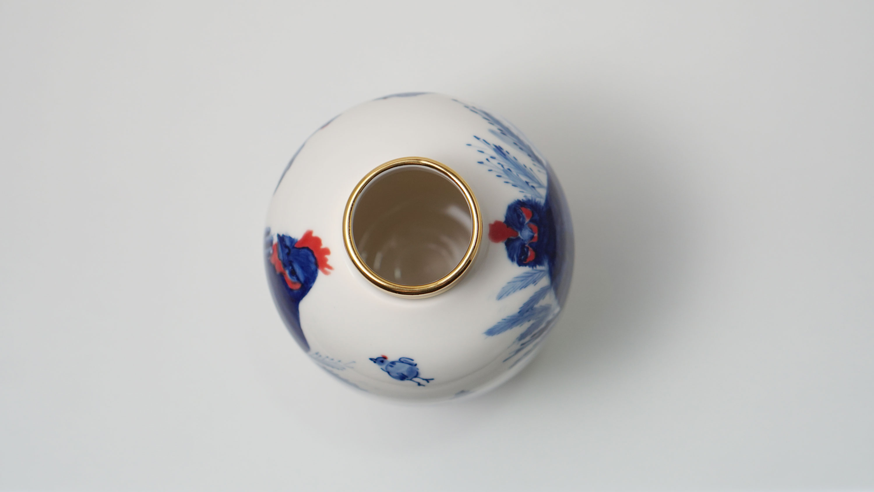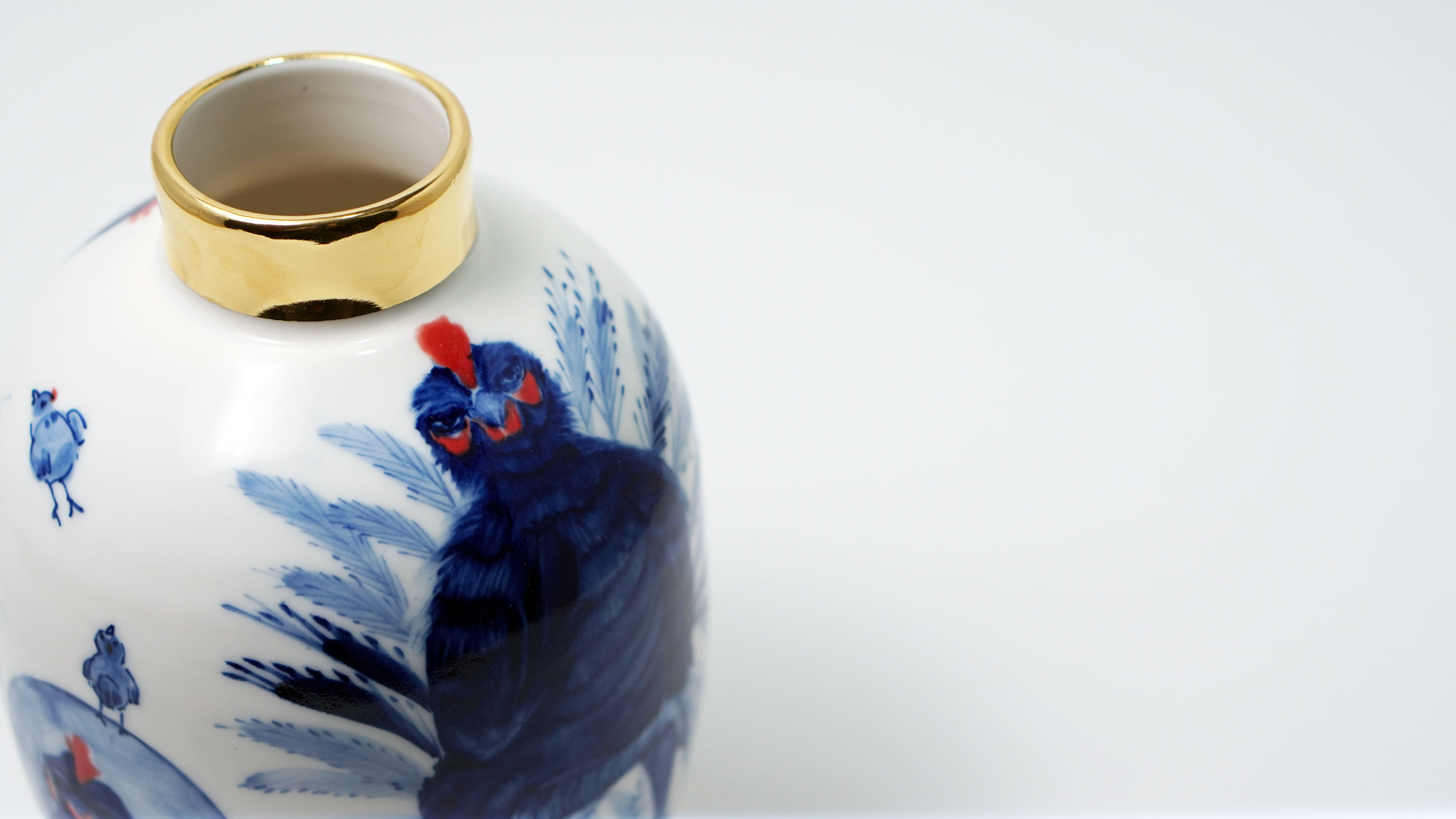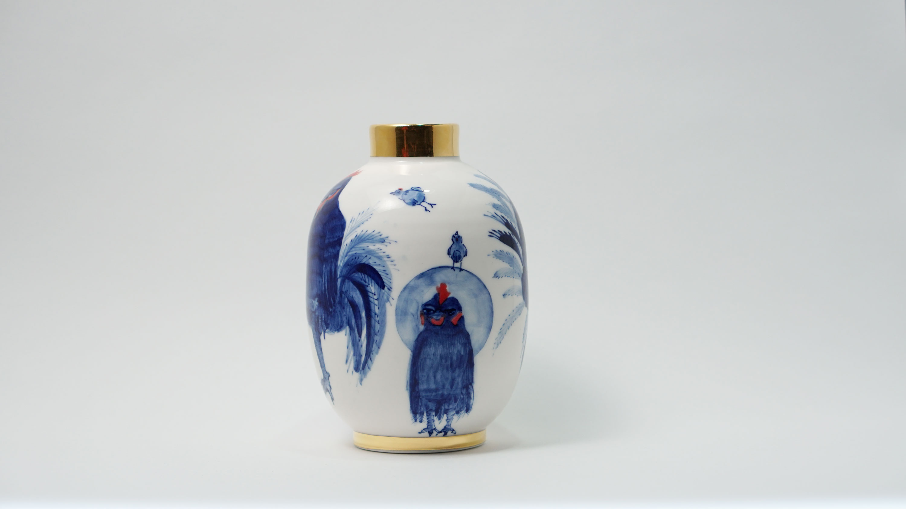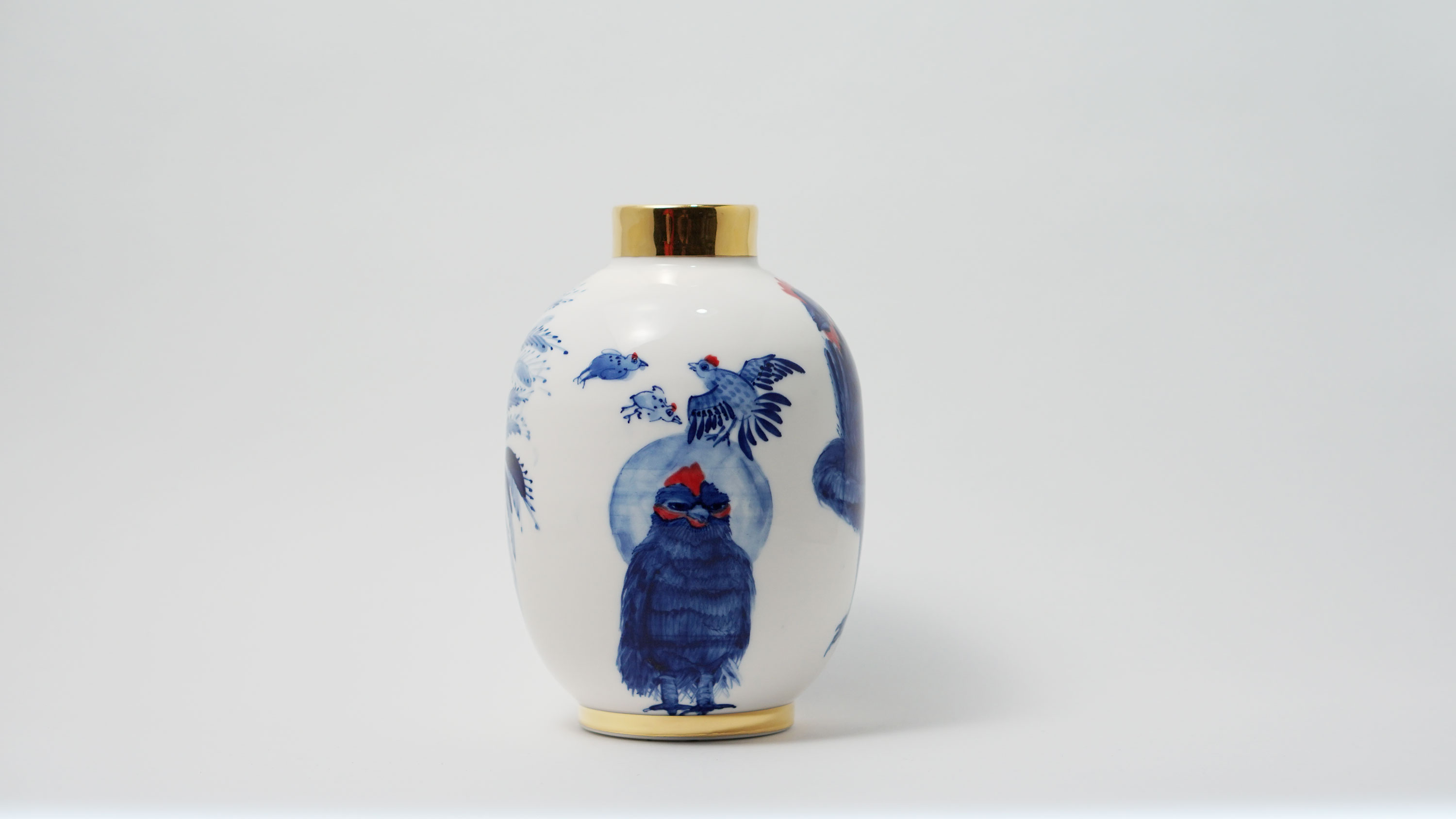 The Moon and Chickens vases are living objects where you can enjoy humorous expressions and playful movements of the chickens. The vases are hand painted and come in a variety of sizes and forms, allowing you to place one or more of them together to make your space even more unique.