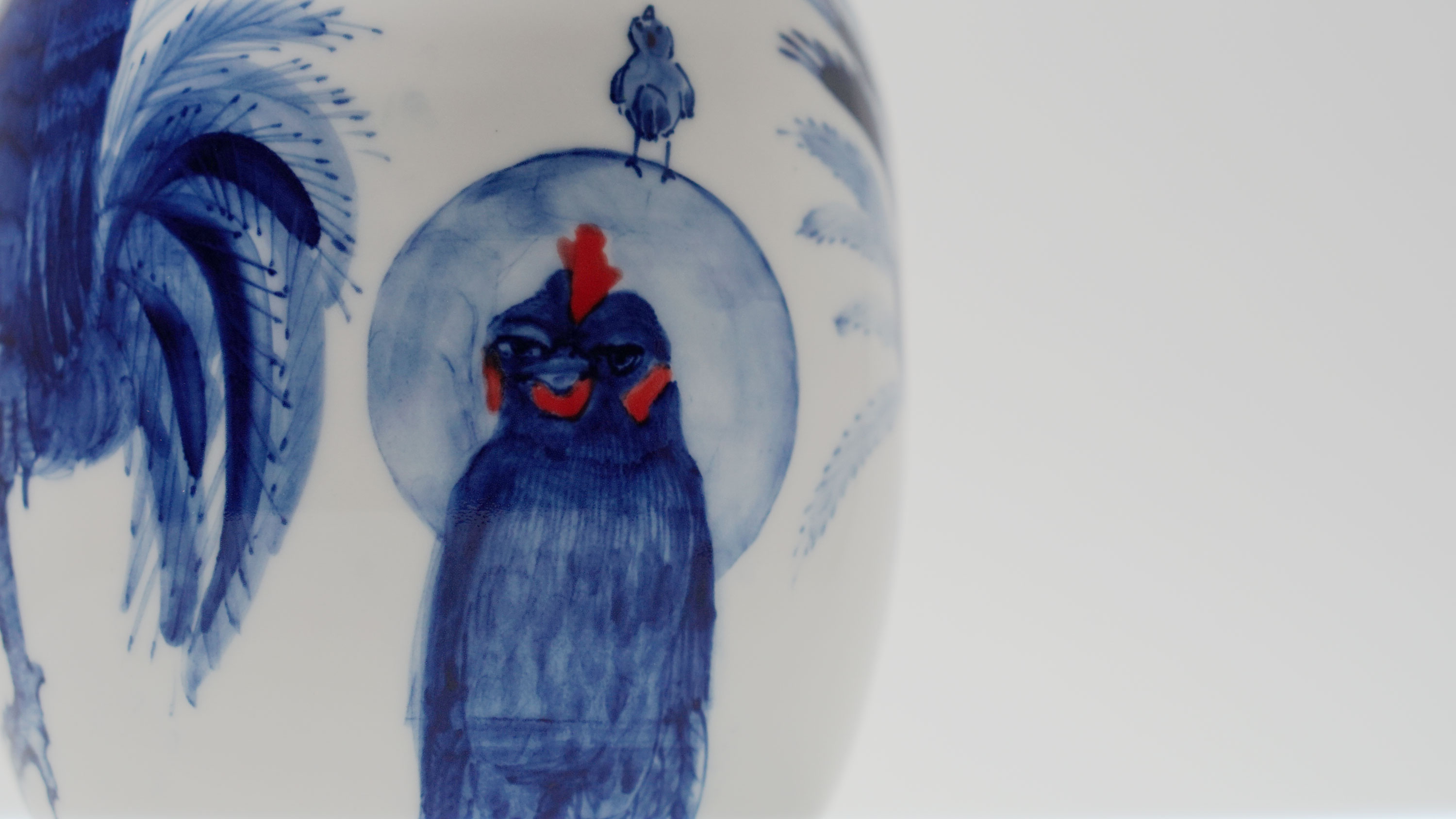 In Korean fairy tales, the moon is an object of imagination and longing, symbolizing fulfillment of wishes and a beautiful unknown world. The series of Moon and Chickens represents the curious and humorous chickens living on the moon where seemingly impossible things happen. The paintings of the Moon and Chickens ceramic objects allow the audience to freely imagine and create their own stories by looking at them from various angles.