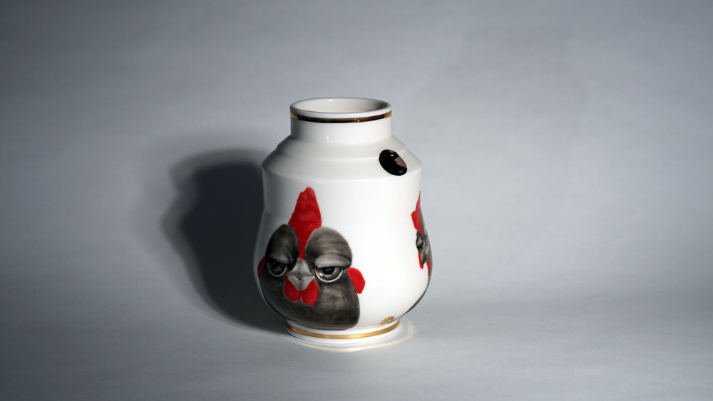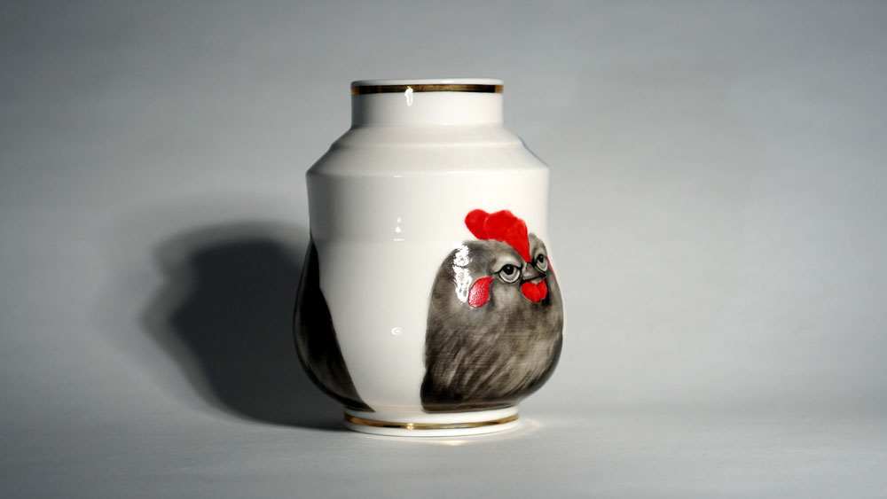 The Moon and Chickens vases are living objects where you can enjoy humorous expressions and playful movements of the chickens. The vases are hand painted and come in a variety of sizes and forms, allowing you to place one or more of them together to make your space even more unique.