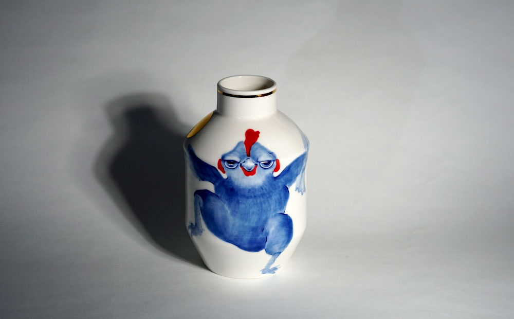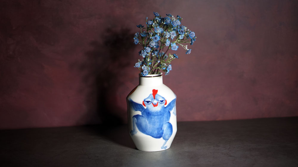 The Moon and Chickens vases are living objects where you can enjoy humorous expressions and playful movements of the chickens. The vases are hand painted and come in a variety of sizes and forms, allowing you to place one or more of them together to make your space even more unique.