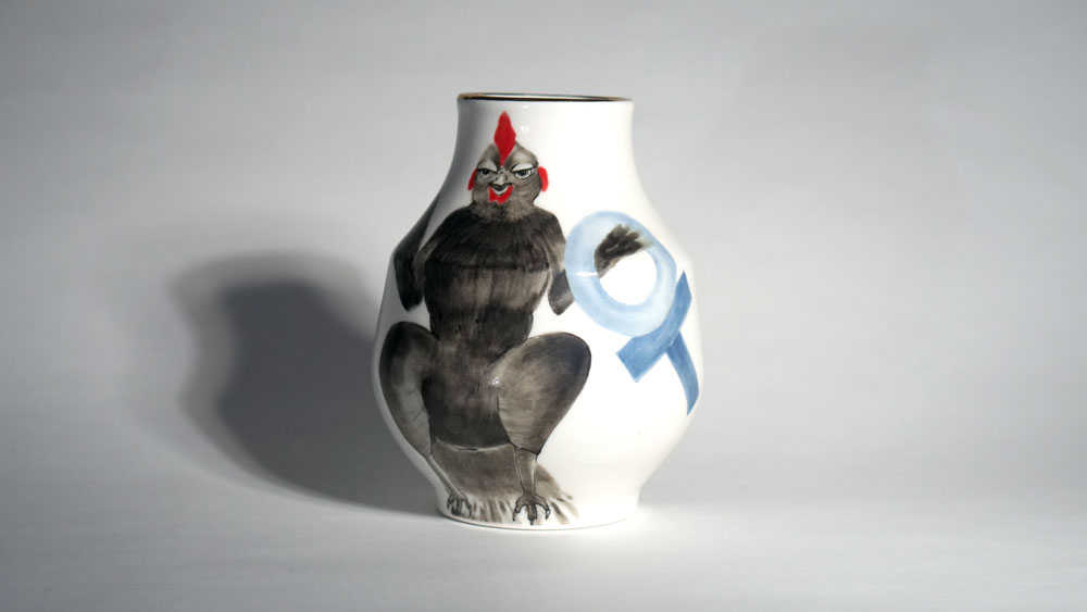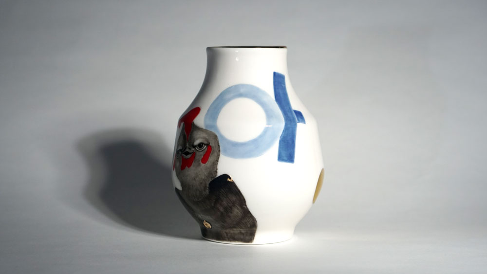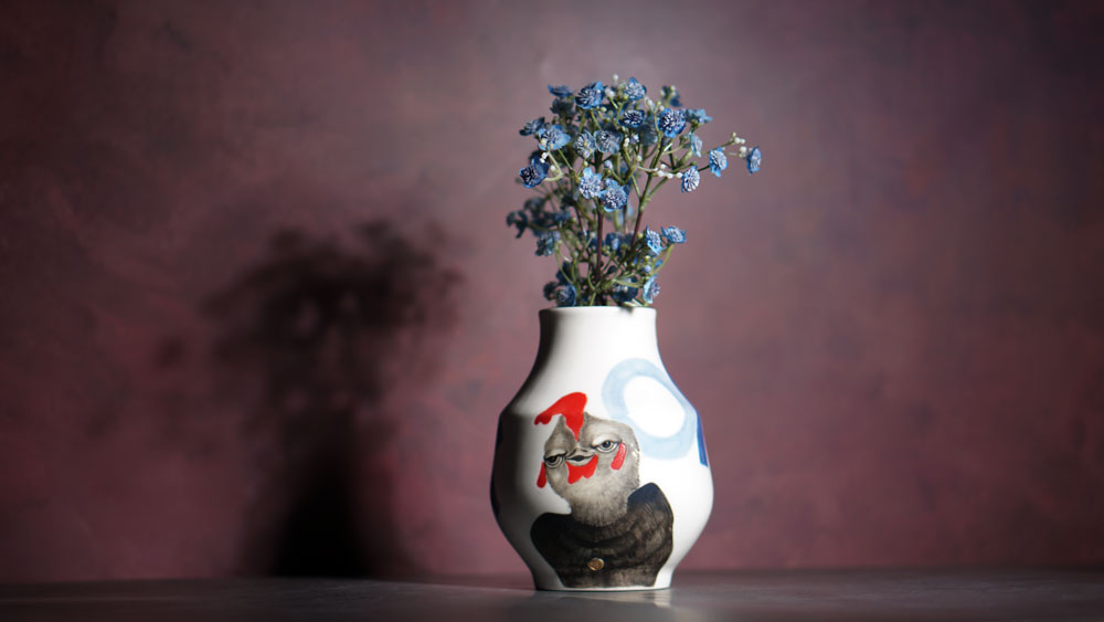 The Moon and Chickens vases are living objects where you can enjoy humorous expressions and playful movements of the chickens. The vases are hand painted and come in a variety of sizes and forms, allowing you to place one or more of them together to make your space even more unique.