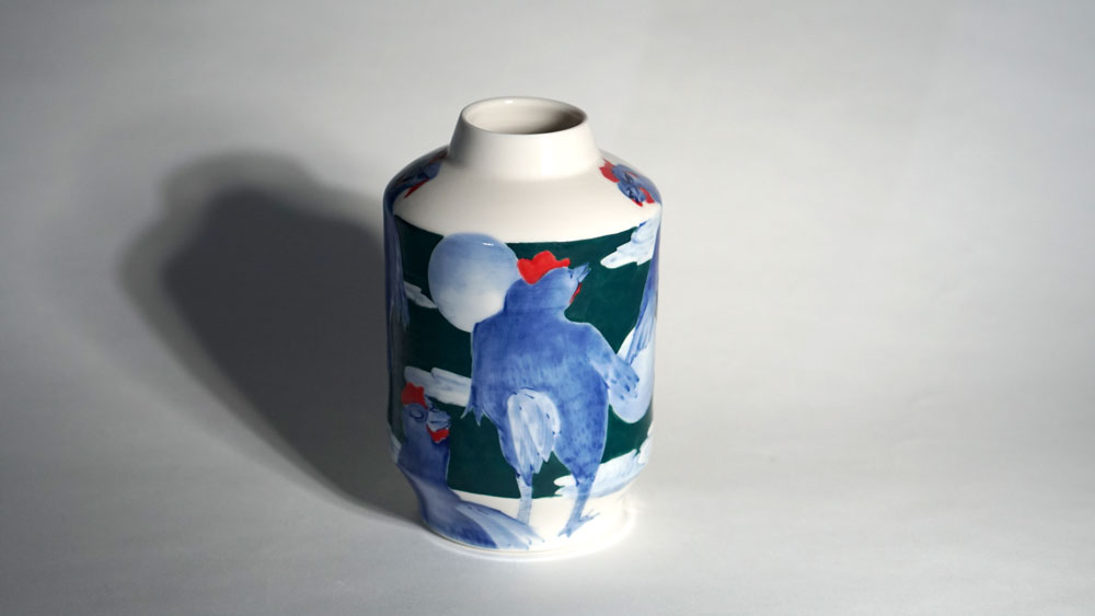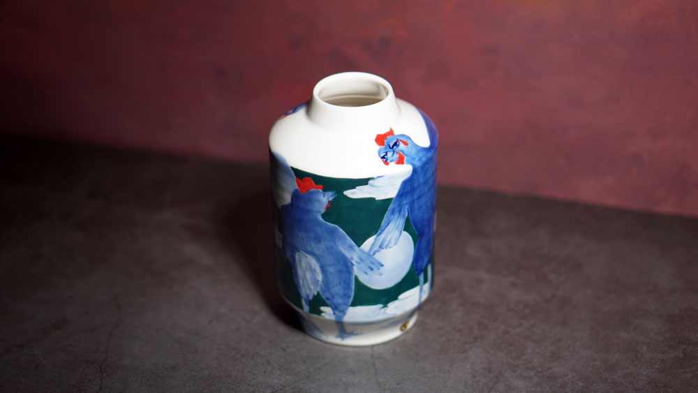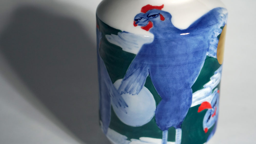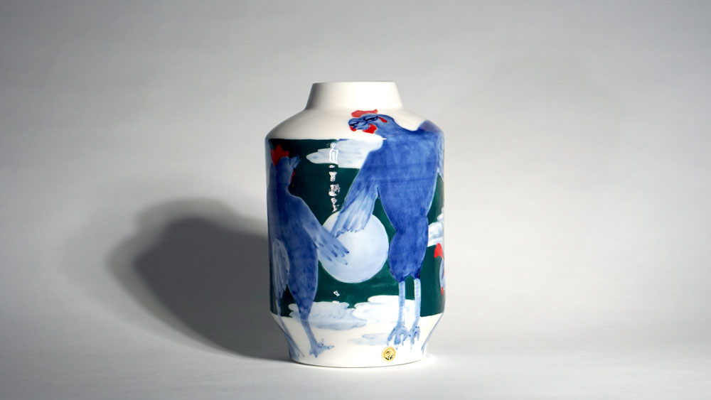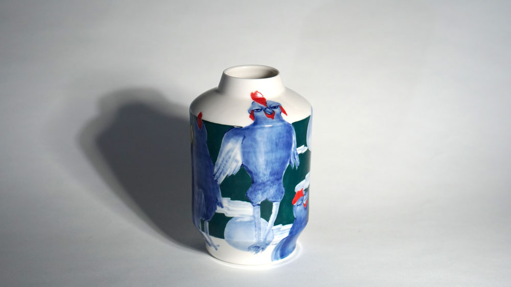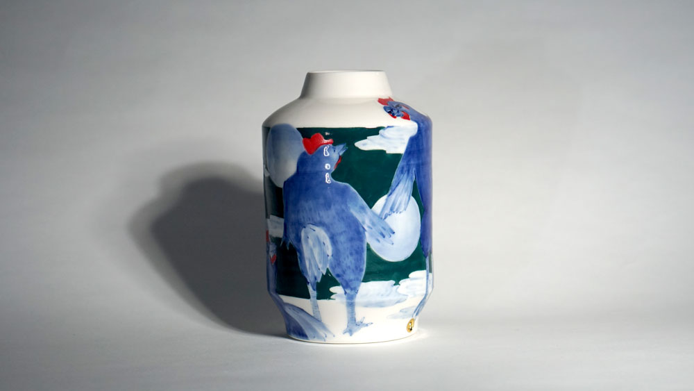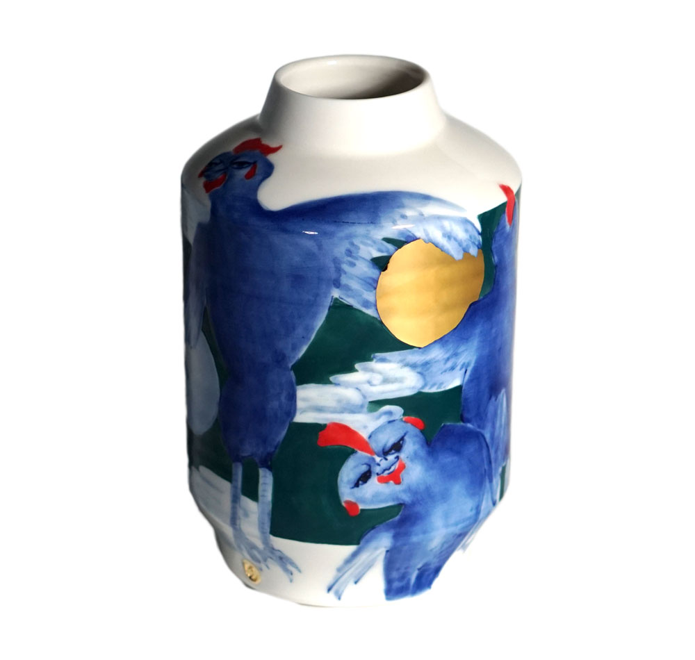 The Moon and Chickens vases are living objects where you can enjoy humorous expressions and playful movements of the chickens. The vases are hand painted and come in a variety of sizes and forms, allowing you to place one or more of them together to make your space even more unique.