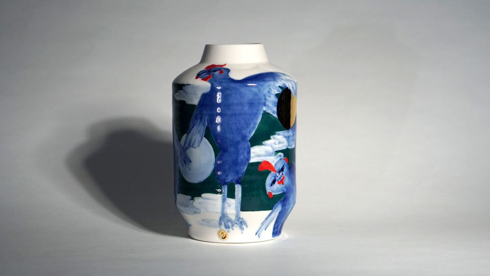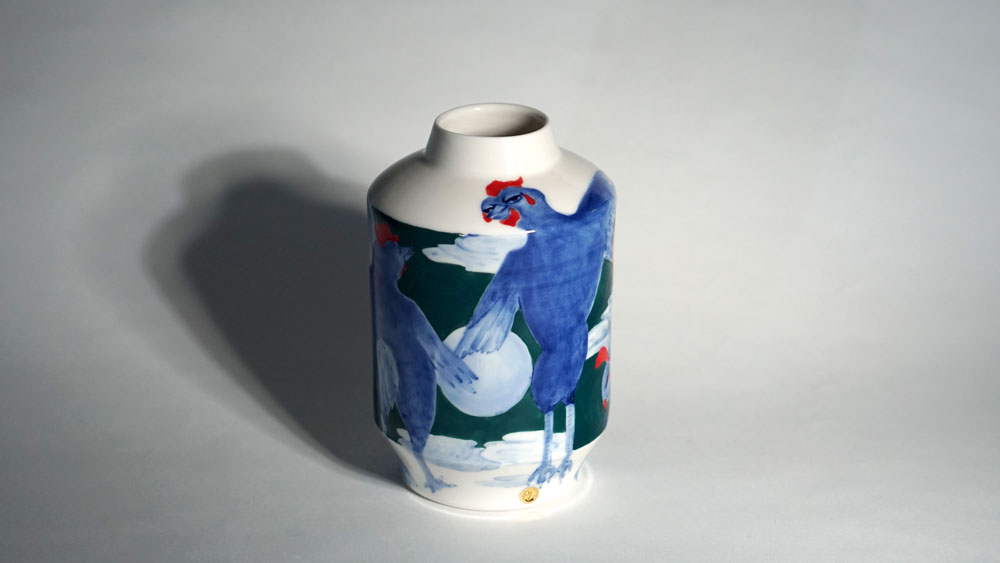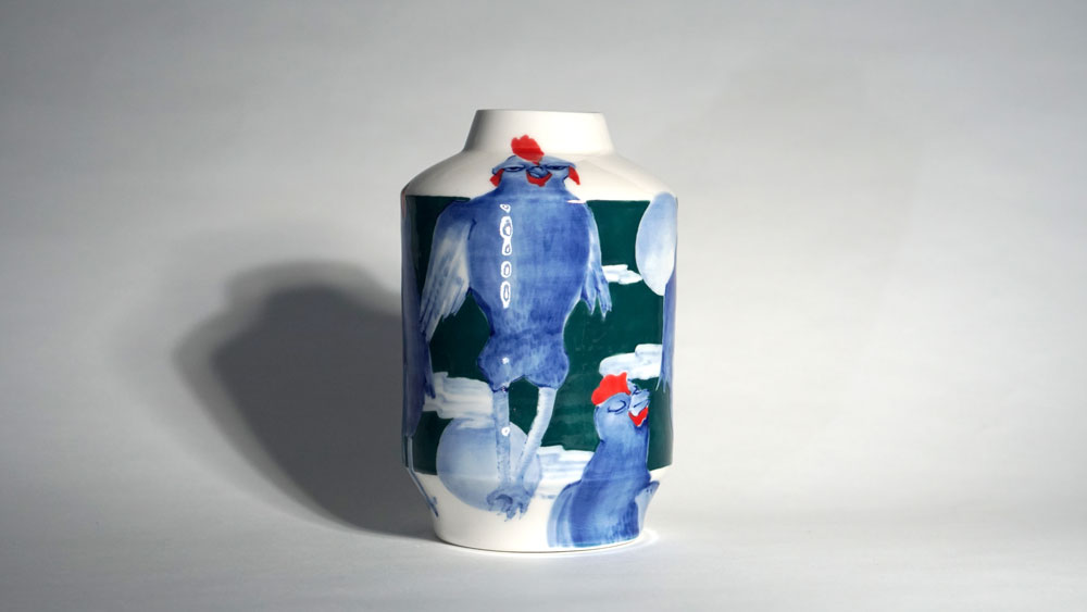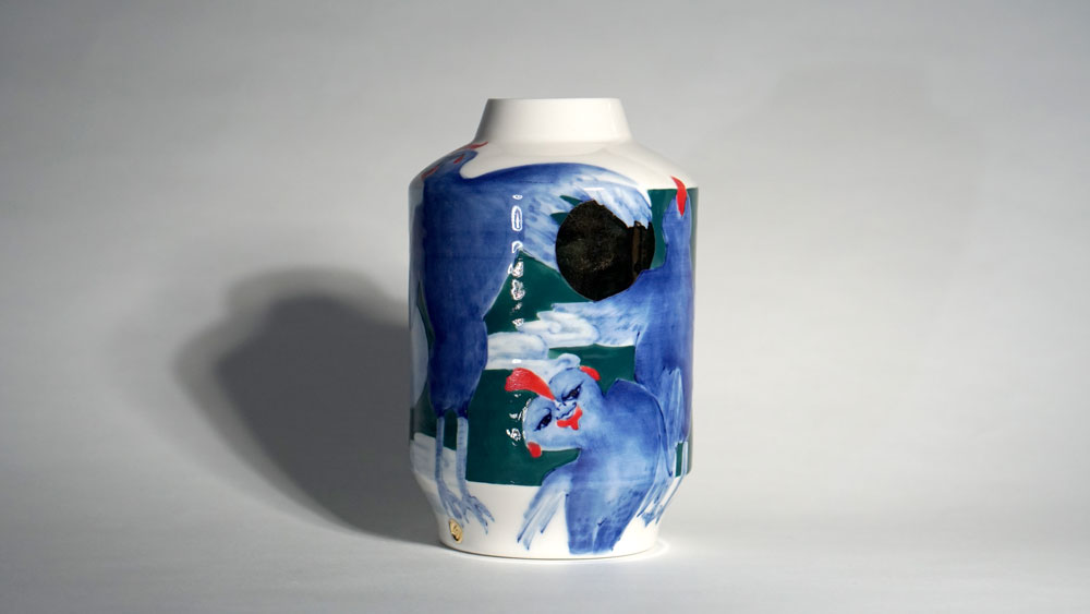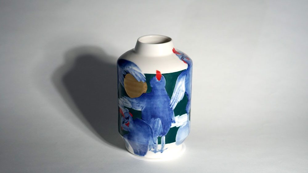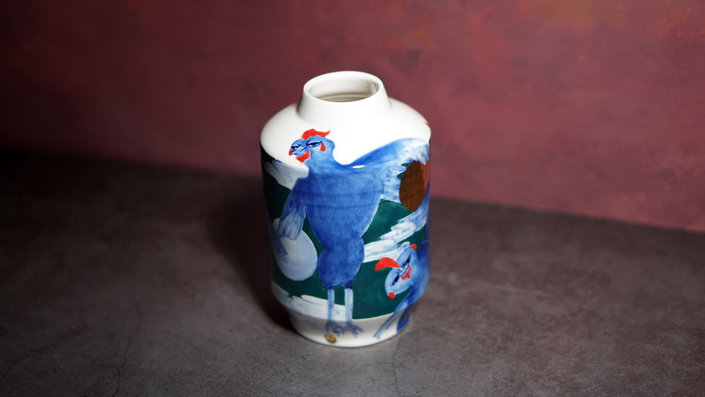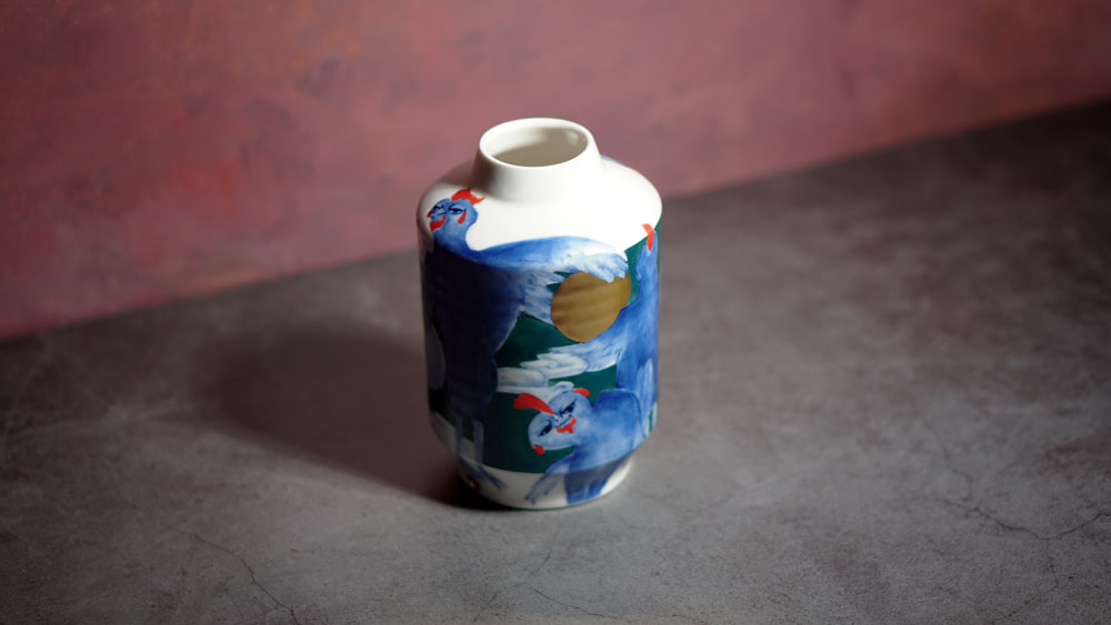 The Moon and Chickens vases are living objects where you can enjoy humorous expressions and playful movements of the chickens. The vases are hand painted and come in a variety of sizes and forms, allowing you to place one or more of them together to make your space even more unique.
