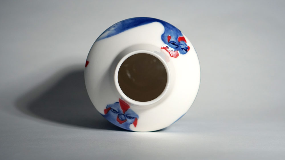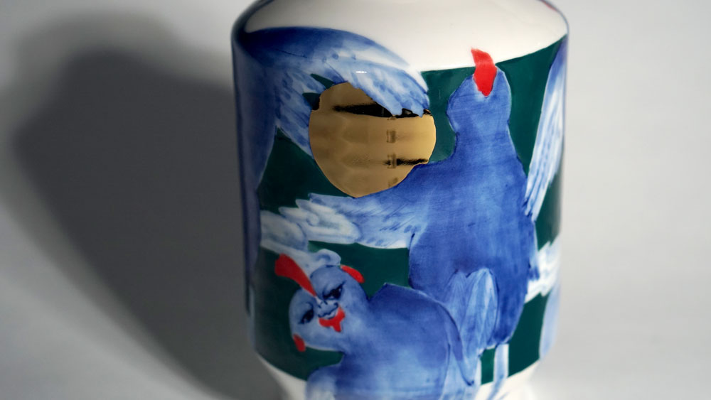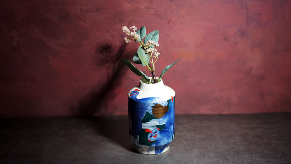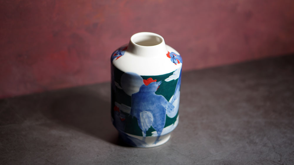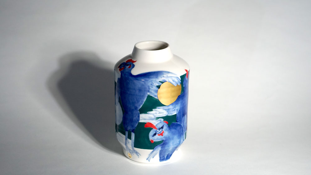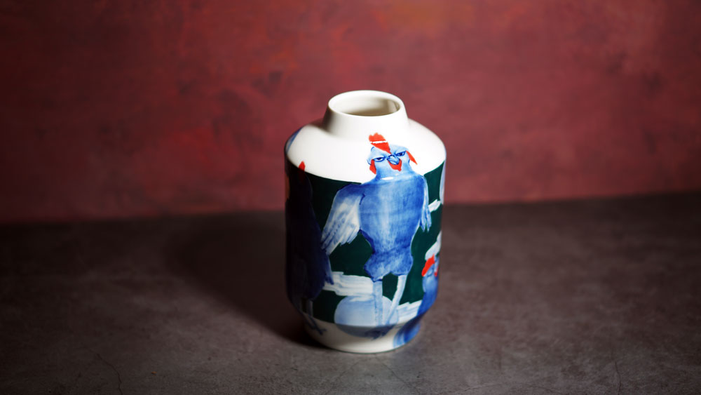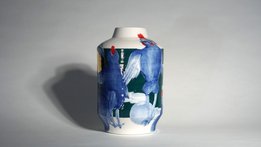 The Moon and Chickens vases are living objects where you can enjoy humorous expressions and playful movements of the chickens. The vases are hand painted and come in a variety of sizes and forms, allowing you to place one or more of them together to make your space even more unique.