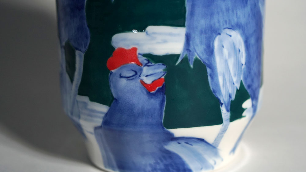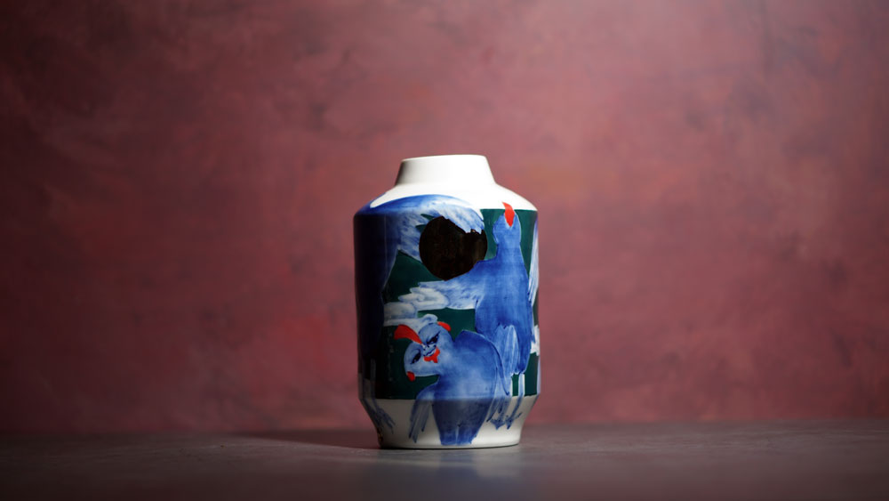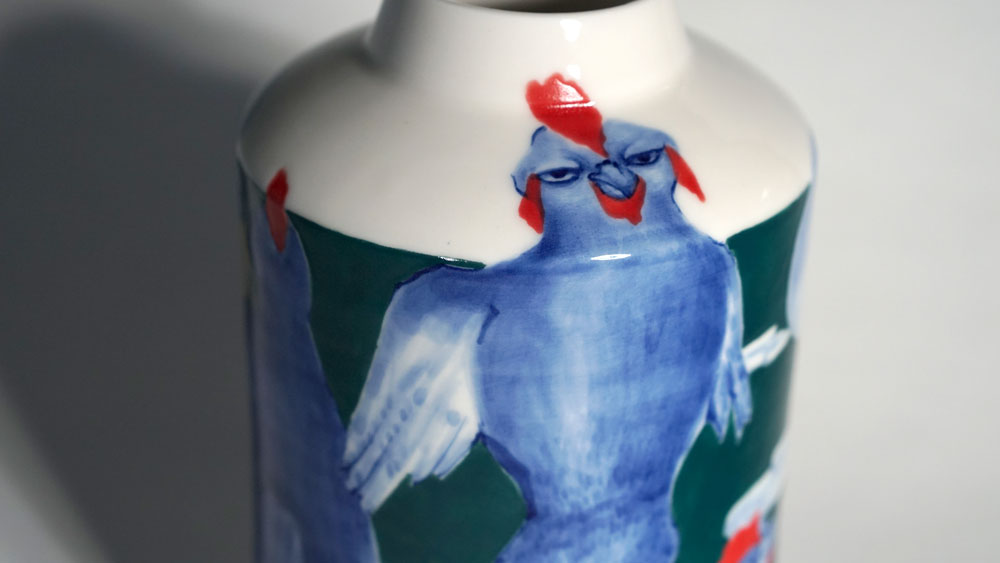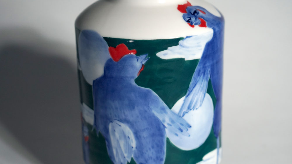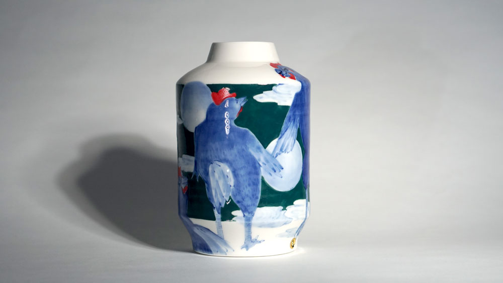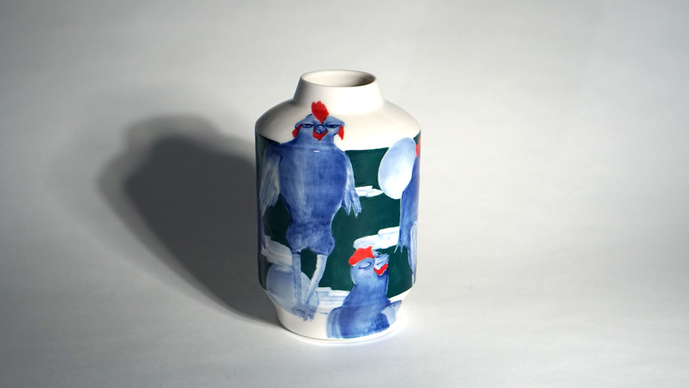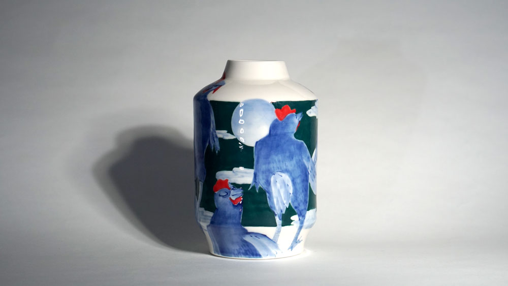 The Moon and Chickens vases are living objects where you can enjoy humorous expressions and playful movements of the chickens. The vases are hand painted and come in a variety of sizes and forms, allowing you to place one or more of them together to make your space even more unique.
